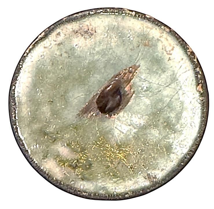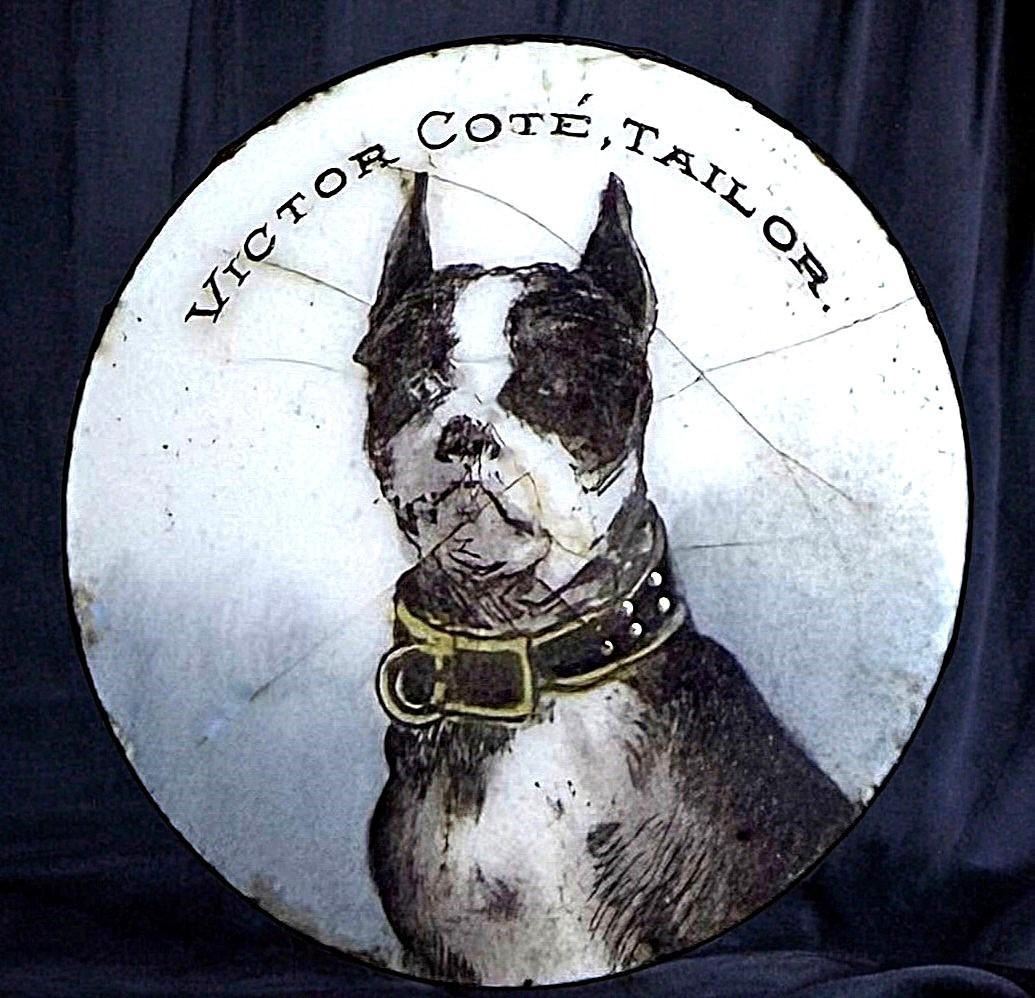 1 Large 19th century Polychrome enamel of a Dog & verbal. Here is a very rare pictorial and counter enameled button. Because of this rarity we had no intention of discarding it even with the STABLE cracks appearing in the enamel as shown. The image attached shows the cracks much more pronounced on camera or under a loop than when seen in person. The dog is accented with gold paillons and again even with the cracks its a cool rare VERBAL example. Estimated accordingly.