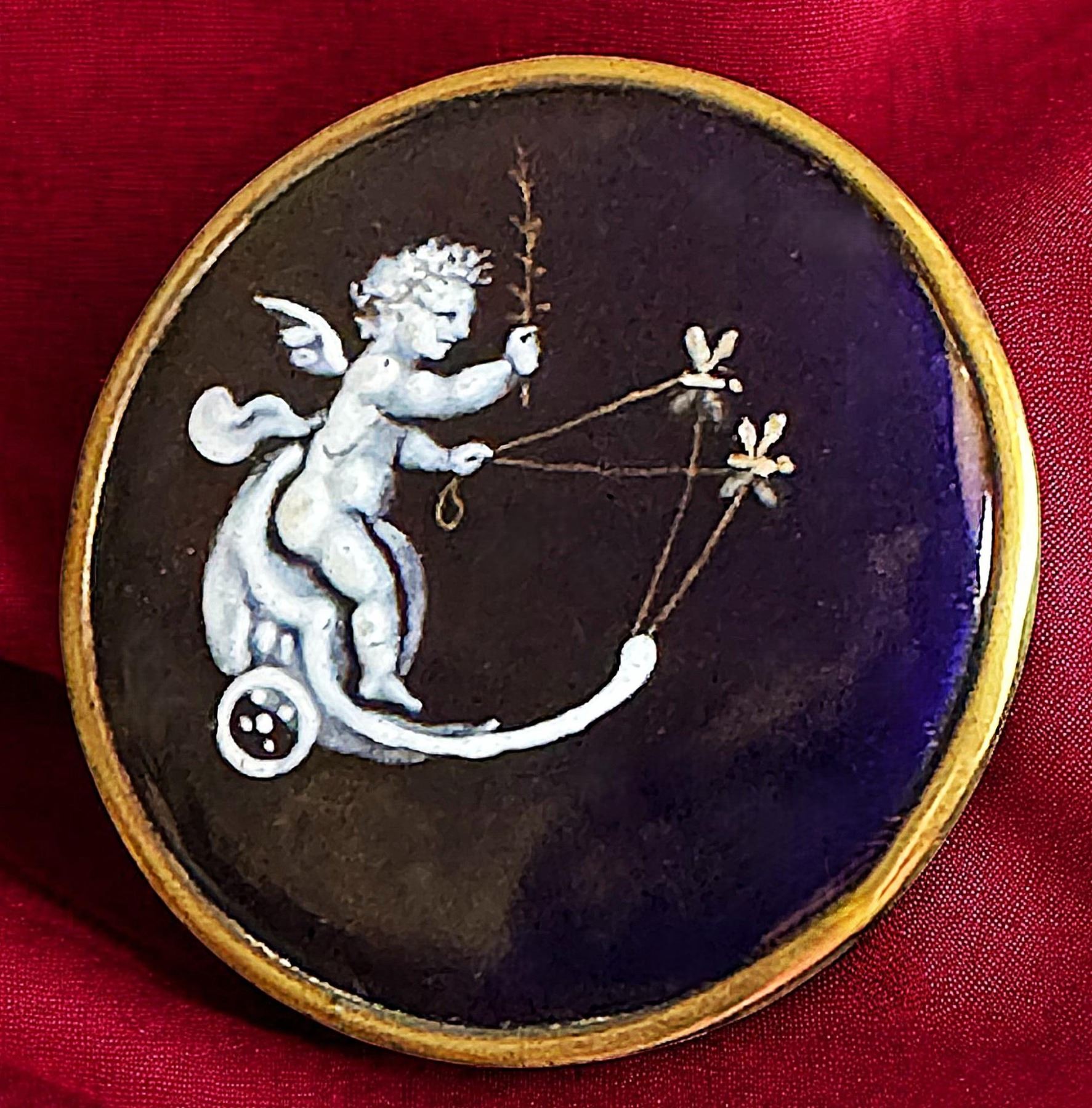 1 Large 18th century cobalt and En Grisaille example. Here is a stunning hand painted enamel from the late 18trh century depicting a cherub rif=ding a cart. The cobalt blue base is enhganced with the white and gray toned En Grisailled enamel technique and accented with areas of gold leaf. All set in a brss rim and back. A gorgeous addition to any collection. From the collection of the late Dorothy Peterson of Virginia and a member of the Martha Washington Button Club.