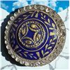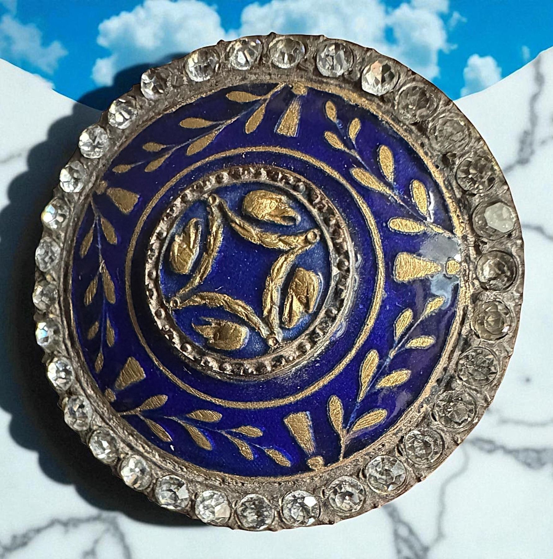 1 Large late 18th early 19th century cobalt enamel example. Bruce told us he has never seen this button before. The striking cobalt blue enamel is enhanced with the gold gilt metal design protruding through the enamel. The center is designed with the depiction of 4 EAGLE heads and the entire design is framed by a brilliant paste border. A gorgeous example of fine design and craftsmanship. From the collection of the late Dorothy Peterson of Virginia and a member of the Martha Washington Button Club.