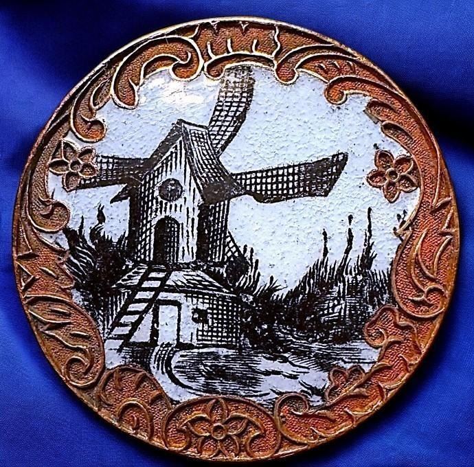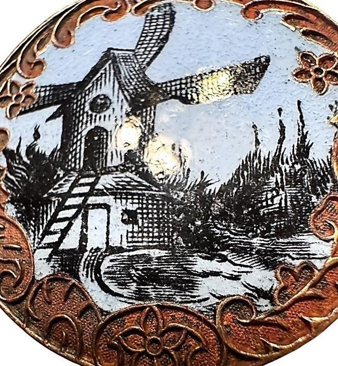 1 Large 19th century monochromatic scene example. Monochrome enamels are always a desirable enamel among collectors and this is a most unusual example in the light blue and black enameling work the artist chose to use. Depicting a Windmill scene this is a nice addition tom any collection.