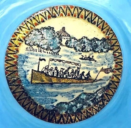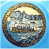 A large 19th century foil enamel scenic example. This is an incredible and unusual old enamel button with a counter enameled back. The boating scene shows 9 figurals on the long boat with other boasts in the distance, along with buildings and mountains or hills in the distance as well. The enamel is done in a creme color base with gold and bluesish foil for most of the scene. Again a very unusual and wonderful example.