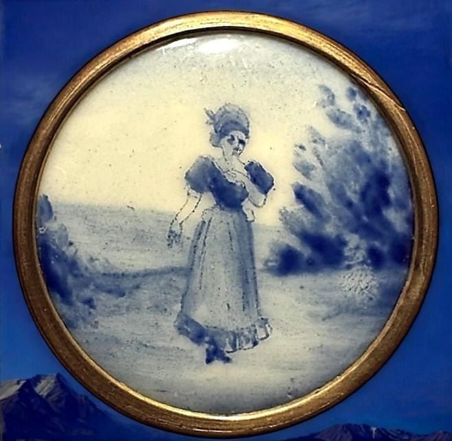 1 Large 19th century monochromatic enamel in metal. Here is a lovely soft Monochromatic button in blue and cr?me colored enamel. The simple but beautiful scene of a women on a stroll is stunning. The enamel technique is in Pate (pronounced Pot enamel) and is a plaquette in a brass mounting,