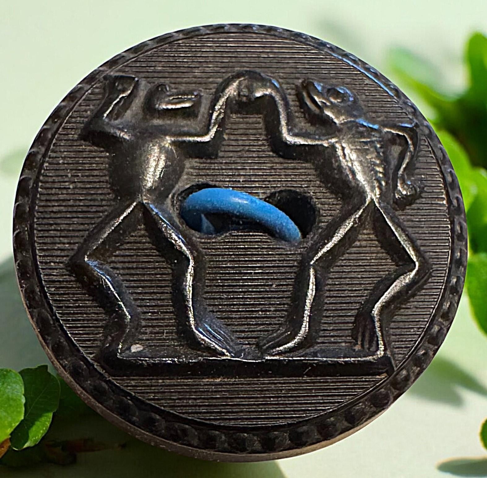 1 Small size 19th C. backmarked Dancing Frogs example. This political satire button has always been a favorite among collectors and very desirable. This example as shown in the images is in excellent detailed and fine condition.