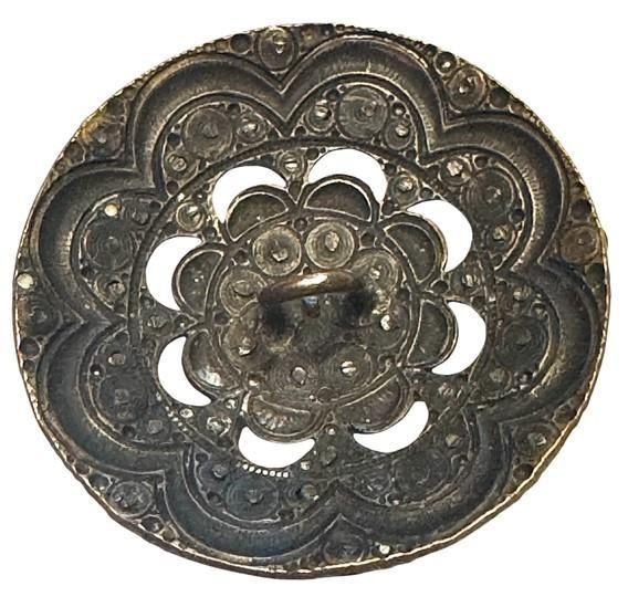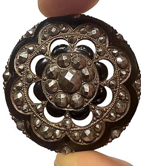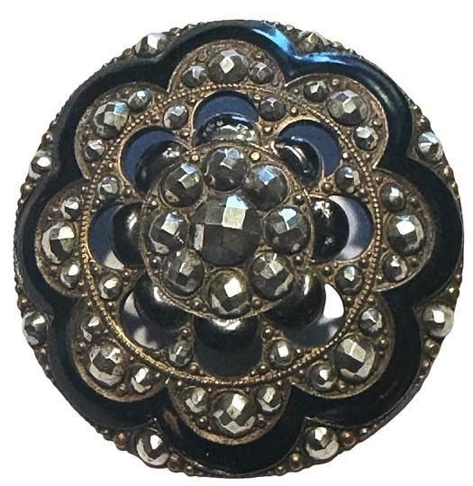 1 Extra Large 19th C. Gay 90 style enamel and cut steel button. Although not a gay 90 button it was made in the same style only omitting a large or multiple small jewels on it. The stunning design is made of brass adorned with lots of cut steels and a nice shiny black enamel,