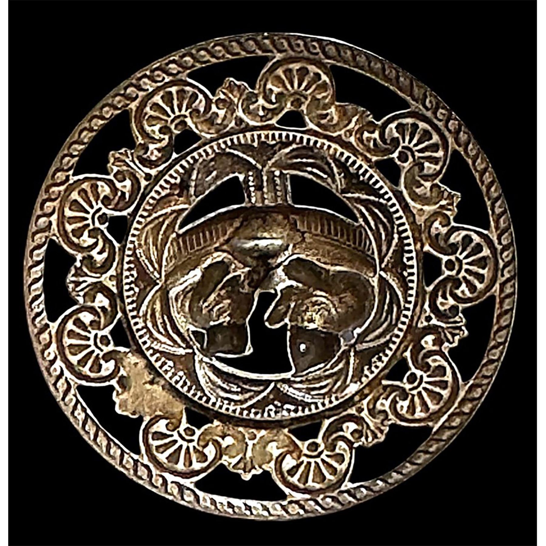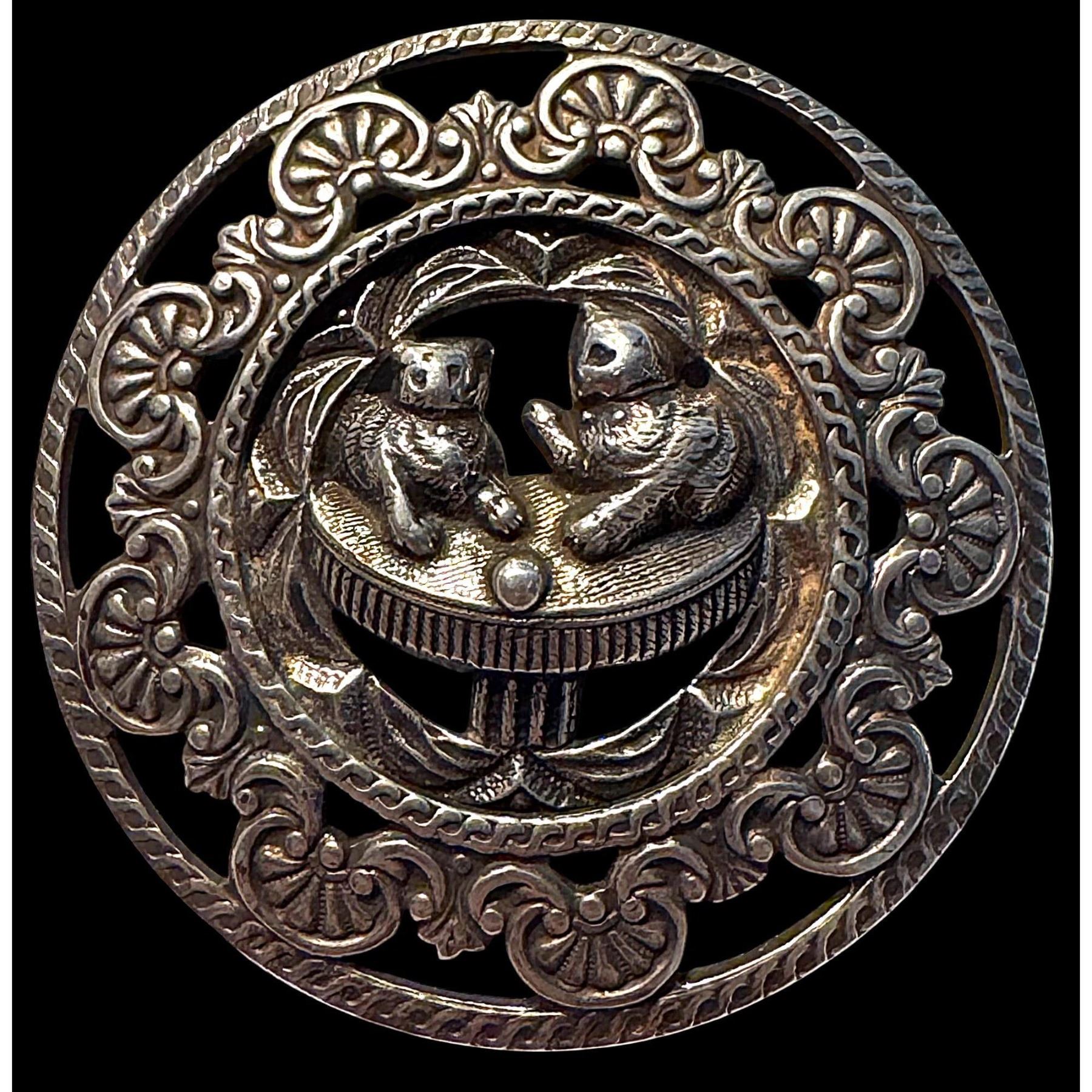 1 Large 19th century silvered brass cat button. This is a very fun and detailed pierced silvered brass button depicting two cats playing with a ball.