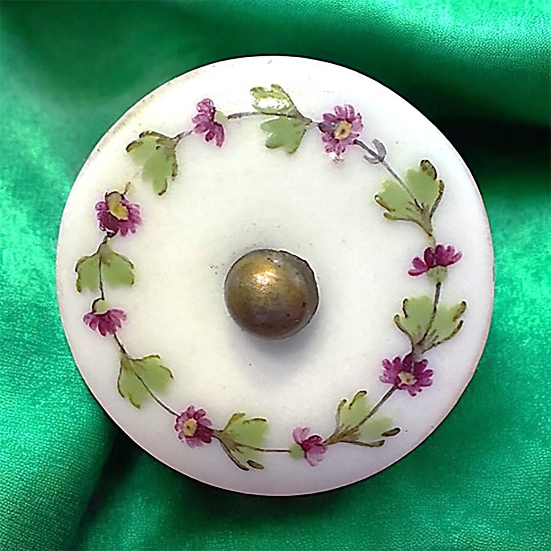 1 Medium size 18th century porcelain pinshanked button. The beautifully hand painted garland of flowers and leaves on this over 225 year old button is in very fine condition and pinshanked with a brass cabochon style pinshank. The colors are striking and vibrant after all these years.