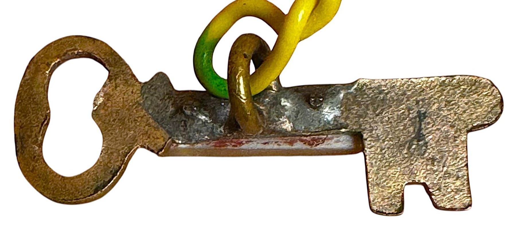 1 Medium size 19th century pictorial KEY example. One may often find the Knife example of these cool realistic brass and pearl buttons, in fact there is one in this auction, and they are always desirable among collectors, however this key example or the ladies boot example and a couple of other designs are much more uncommon to find.