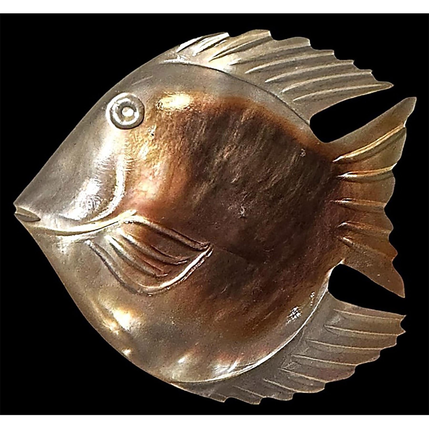 1 Ex-Large early 20th century brown shaded detailed fish button. Here is a beautiful carved and shaded brown realistic fish button with carving and engraving. The detail and size is impressive.