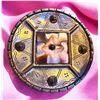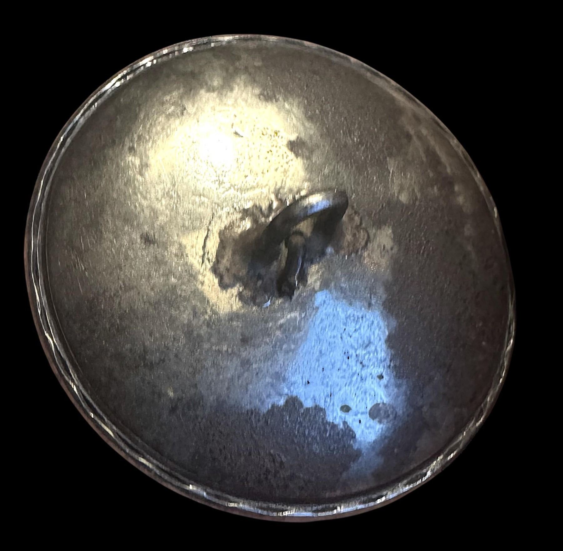 1 Large medium 19th century cowrie shell patterned example. We recently received a small collection from a non mainstream button collector who apparently specialized in steel cups and large jewel buttons, and lots of them in fine condition. Here is beautiful hue on this cowrie shell centered steel cup. A must have for all you steel cup lovers.