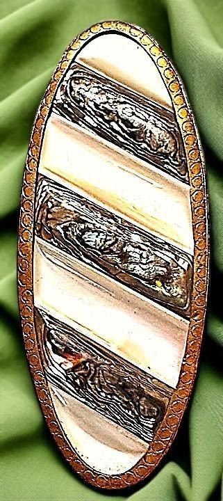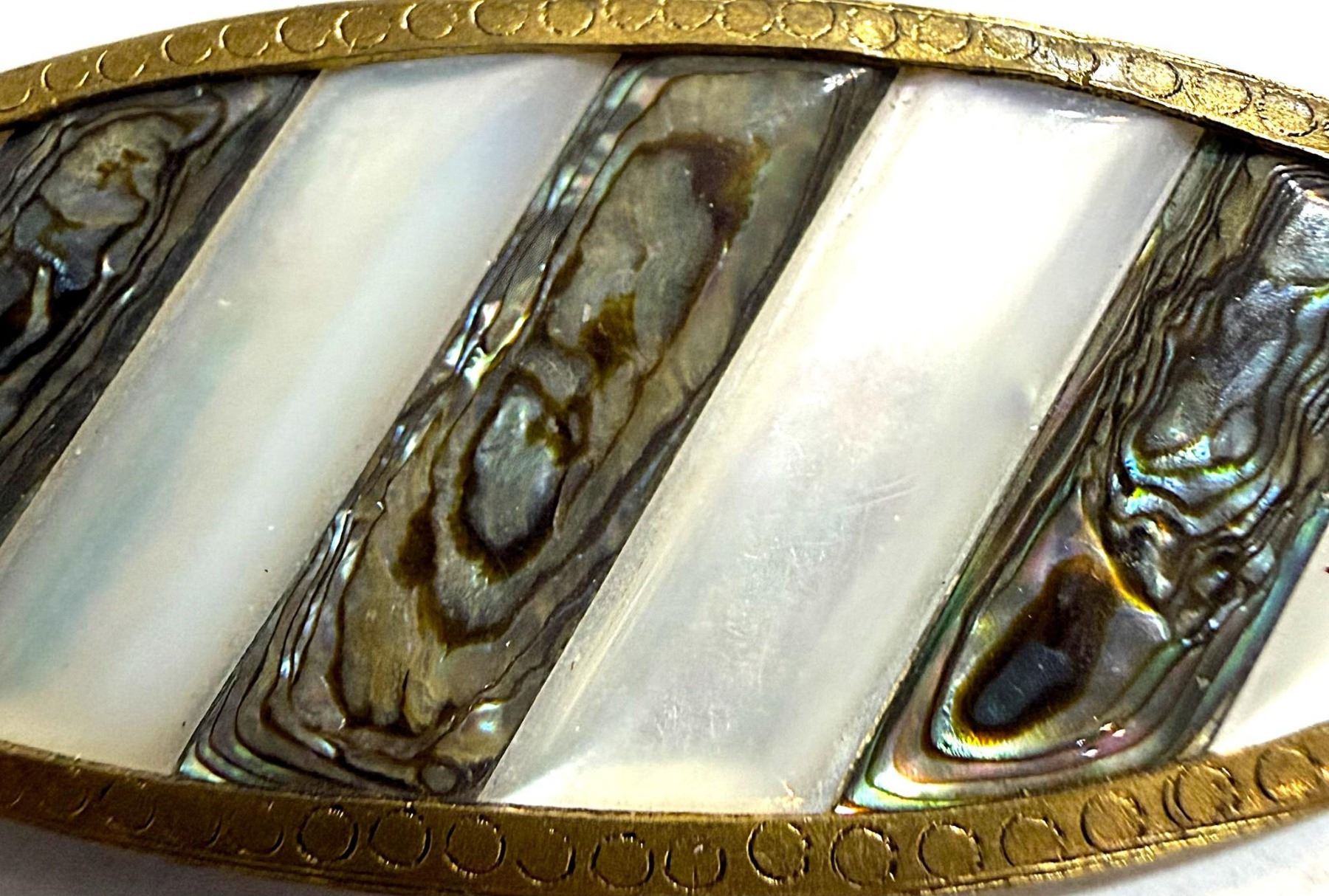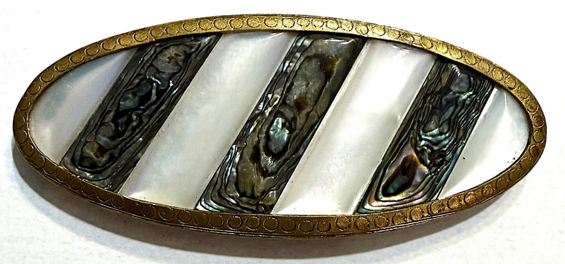 1 Large 19th century pearl and Abalone oval example. Here is a very nicely carved pearl with laminated Abalone shell intermixed between the white sections of the pearl and all set in a high quality brass mounting.