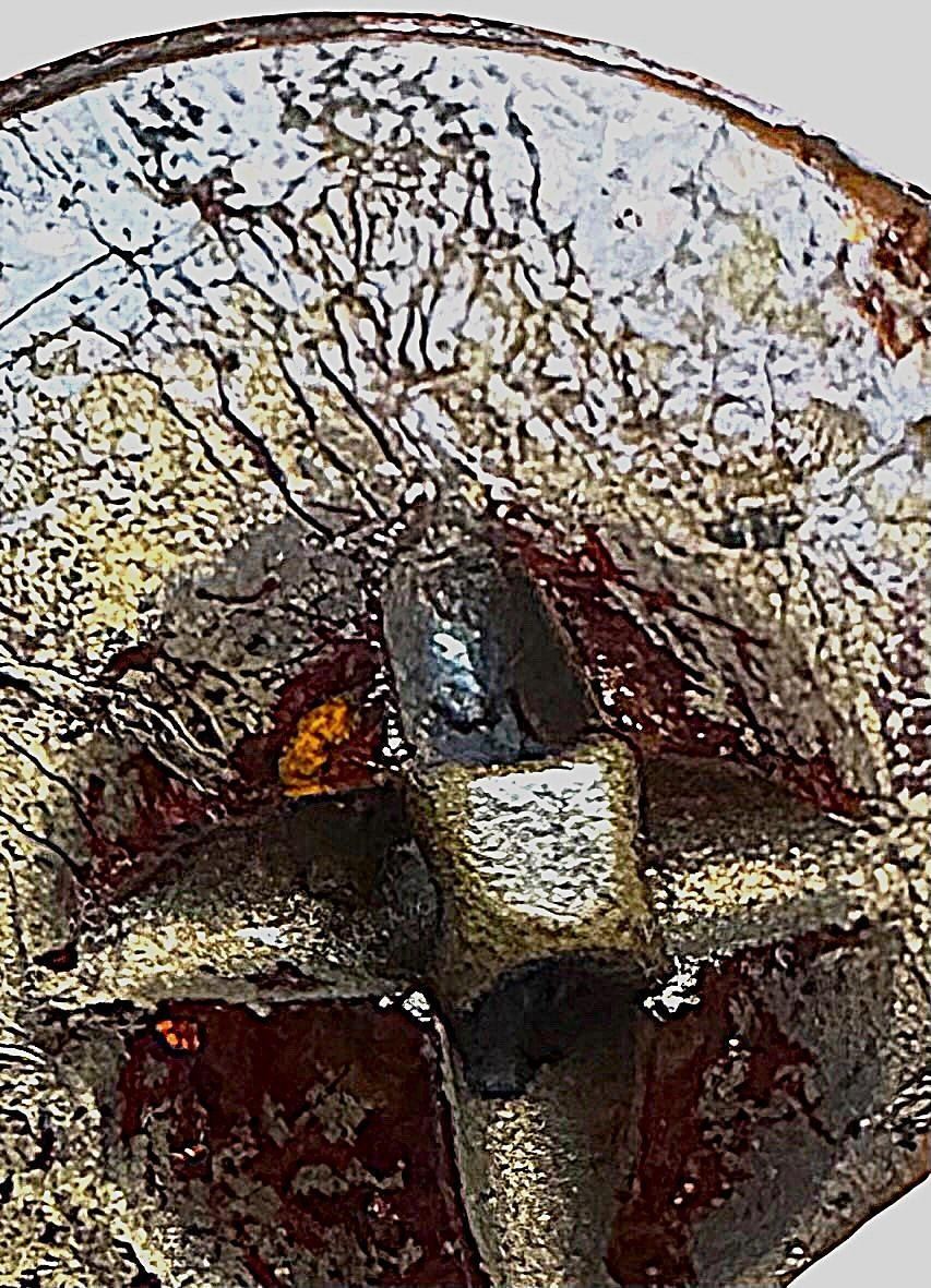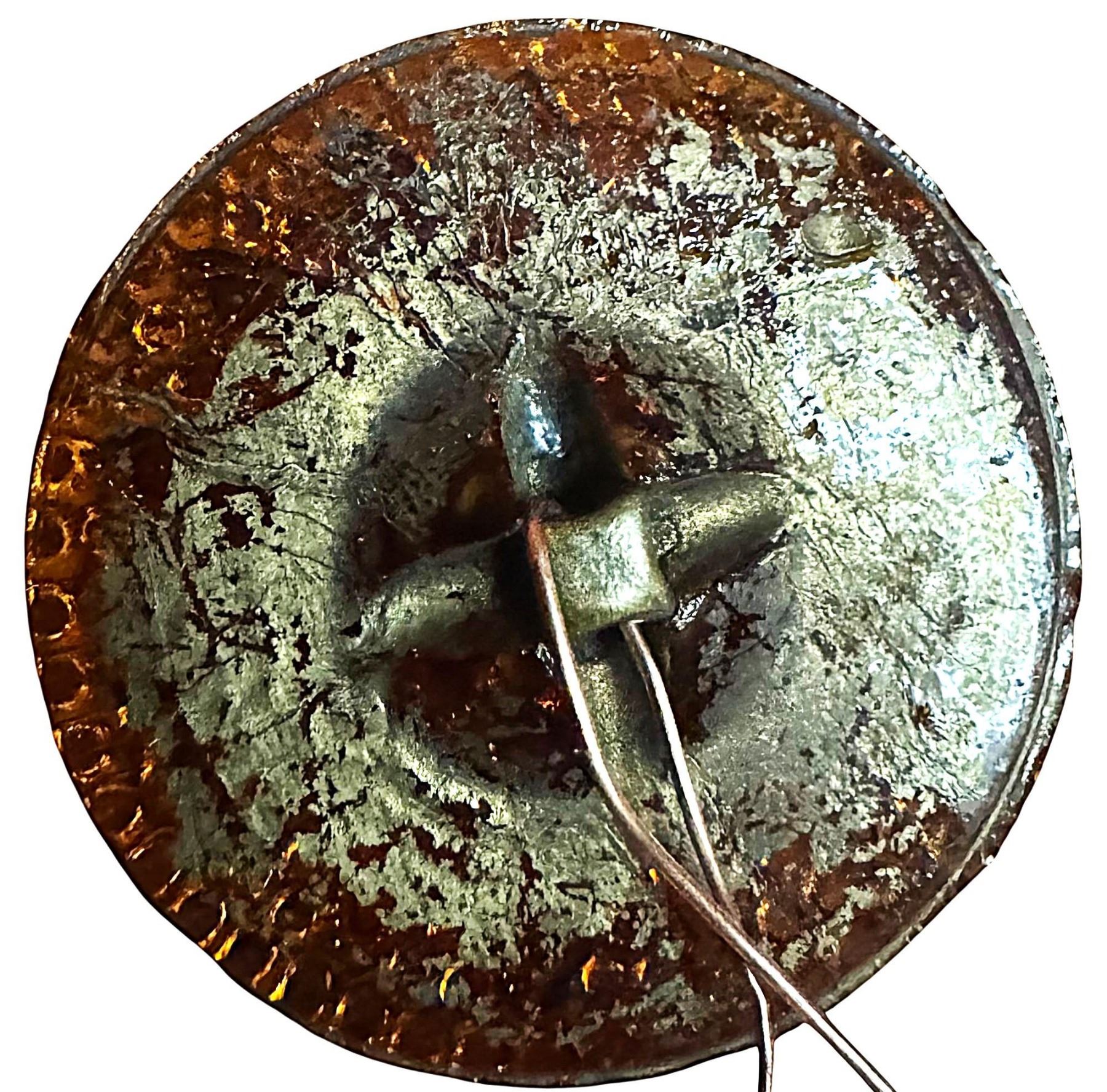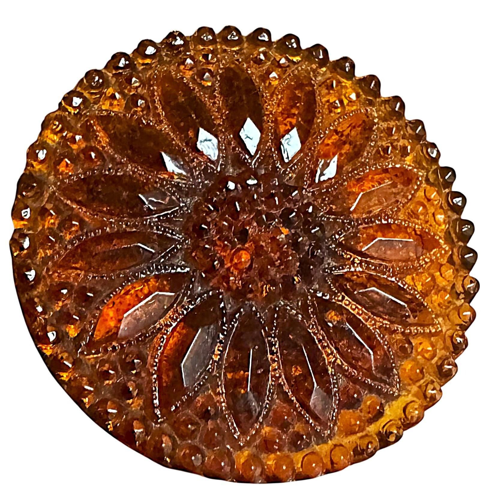 1 Medium 19th century full body amber colored example. This button from the surface is a lovely amber colored flower head lacy glass button, but I have only seen this particular type example twice before on two different collectors 1st place competition trays. What is so rare is that on the back it has a pictorial backmark as shown in the closeup image. Although the gold paint is worn on this example it is a full body colored example so that wear does not detract and with its extreme rarity doesn't effect the value in my opinion.