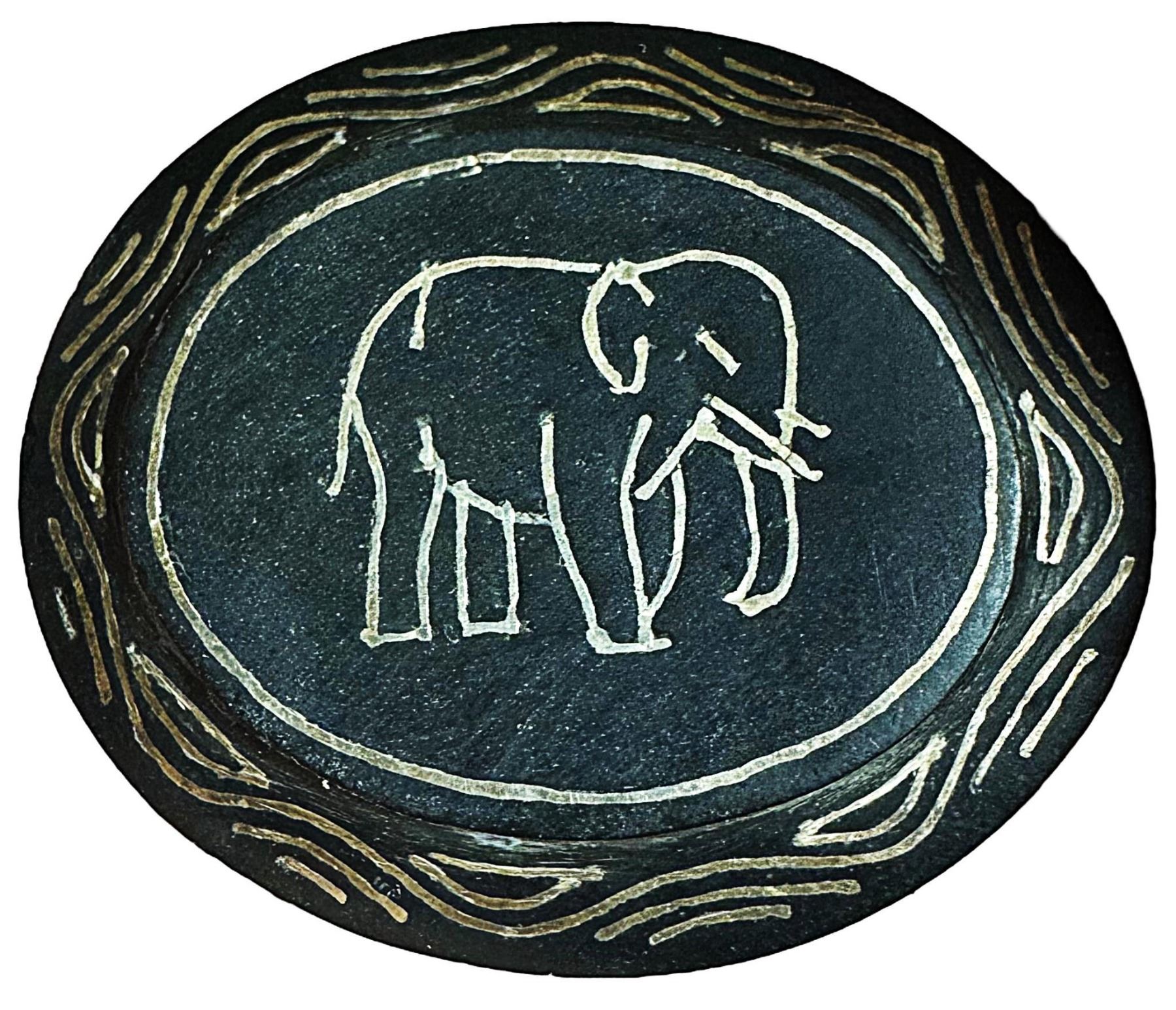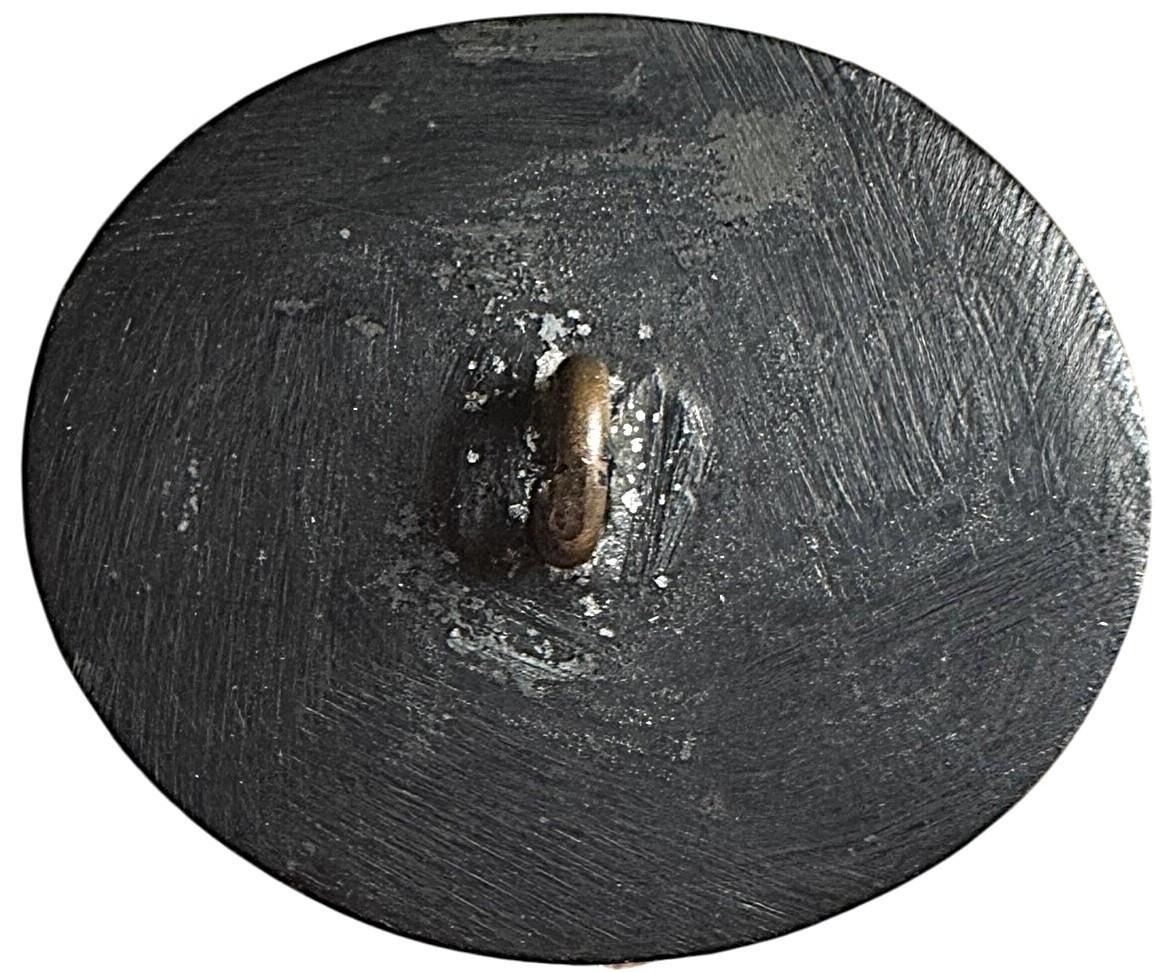 1 Large 21st century oval Bidri silver with an Elephant. Here is one of the buttons that were commissioned by Kay Ferguson that is considered a Bidri example. Many of the buttons she had produced are set with a different material in the center and are considered that material for competition purposes. However this example is all Bidri metal. Nice example.