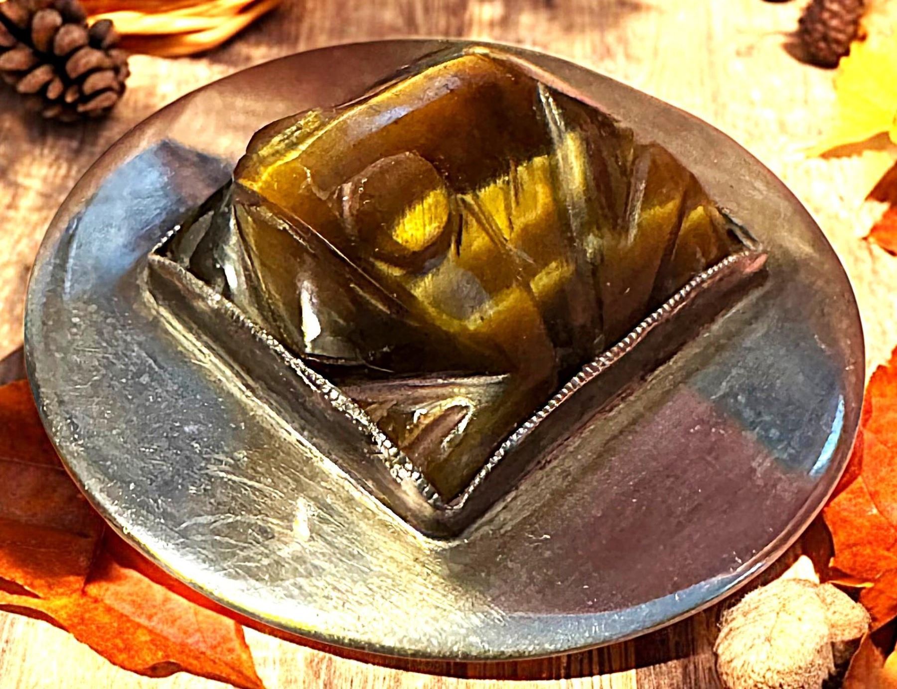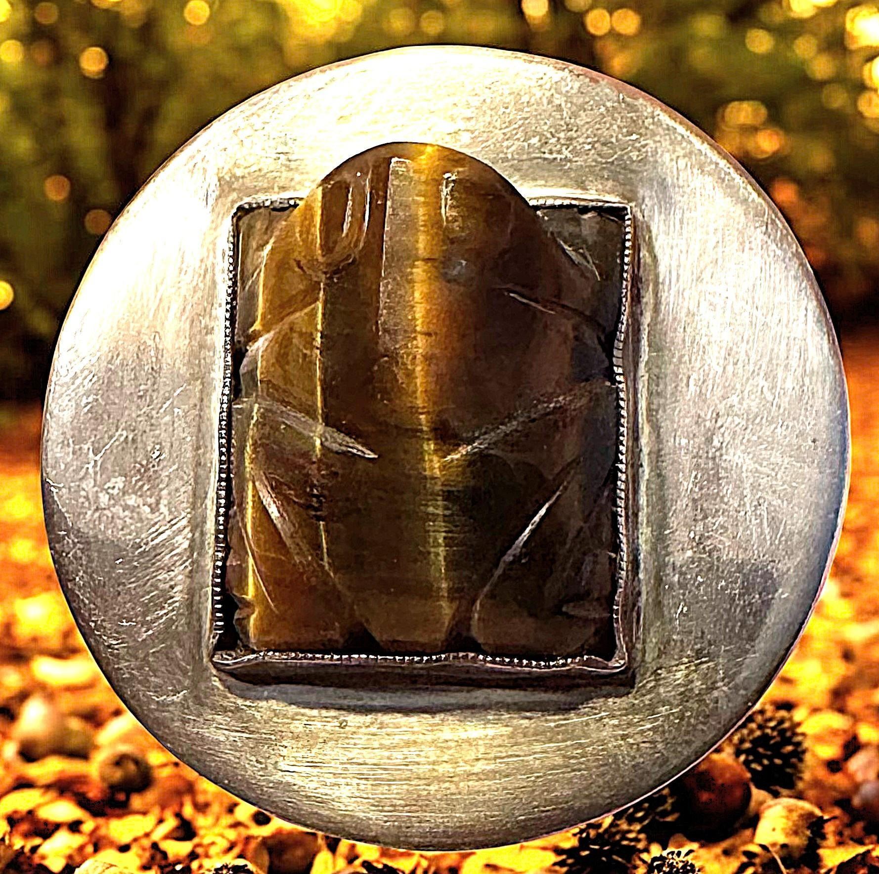 1 Medium size 20th century carved Tiger Eye frog example. Anther nice gemstone from the Nikki Deal collection is this carved and engraved frog made from genuine Tiger Eye semi precious stone and set into a silver mounting.