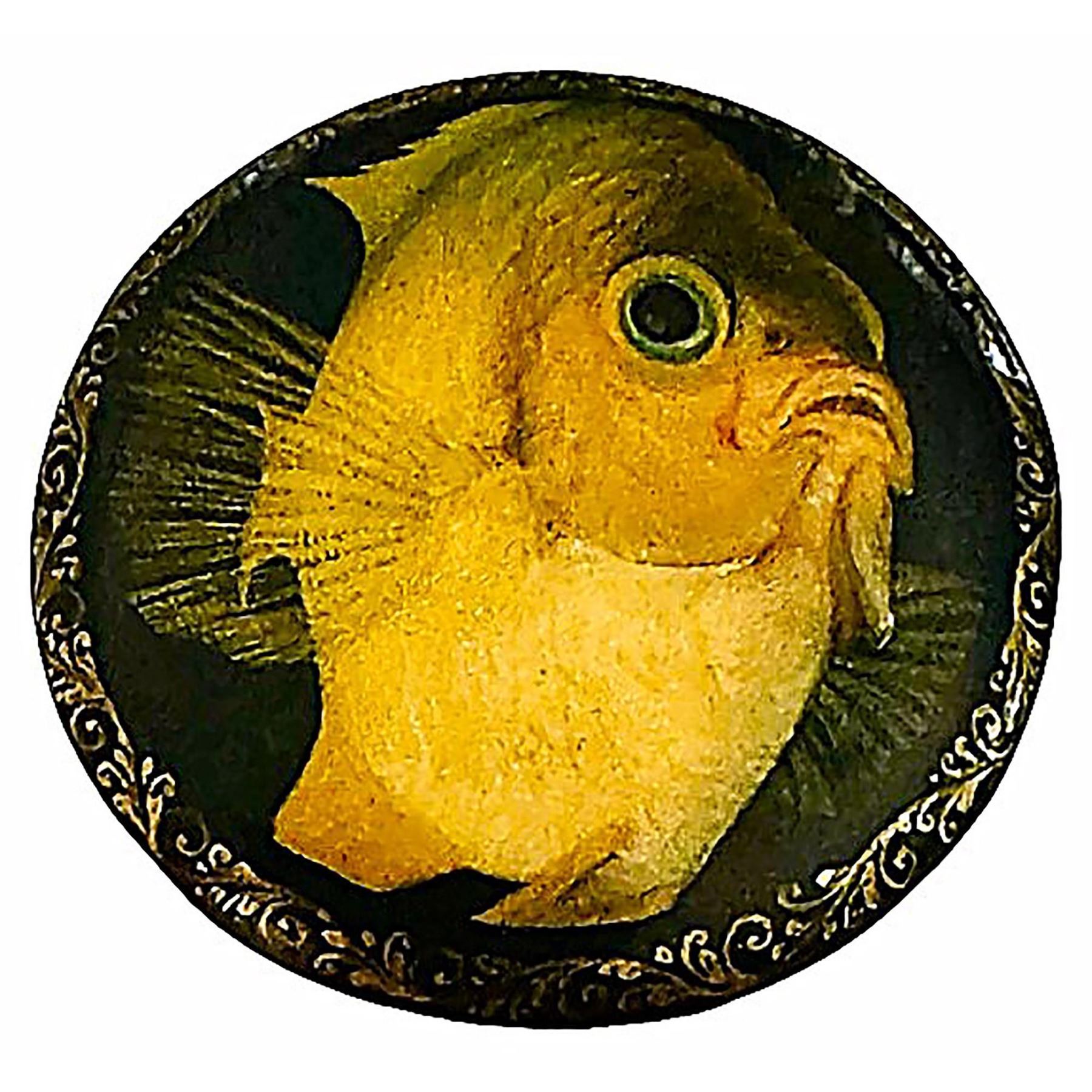 1 Large 21st century Russian Lacquer pictorial fish button. Here is a beautiful example of the Russian fine work hand sone in Lacquer work in the early 200's. Signed and dated on the back.