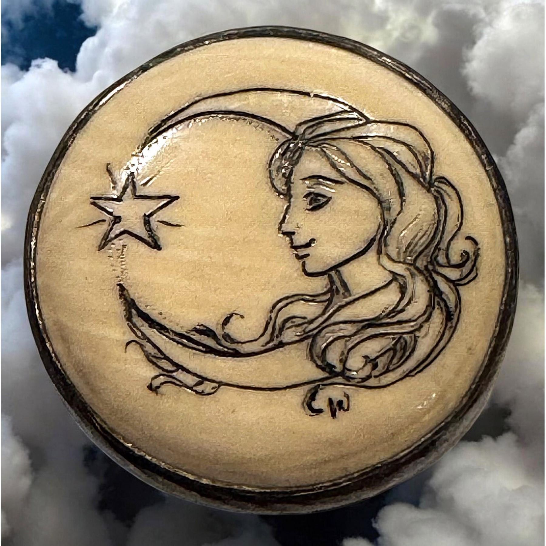 1 Small size 20th C. engraved and pigmented example in sterling. Here is a very cool and detailed engraved and black pigmented scrimshawed natural material set in a backmarked Sterling mounting depicting a detailed Art Nouveau style women on a moon with a star. An unusual subject matter. Signed EK and very well executed. Nice button and beautifully made.
