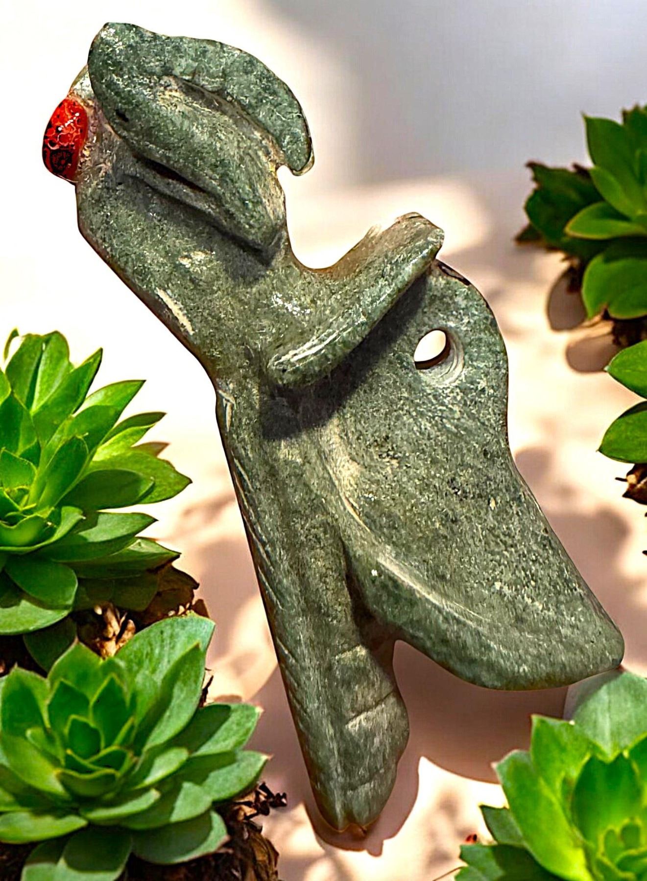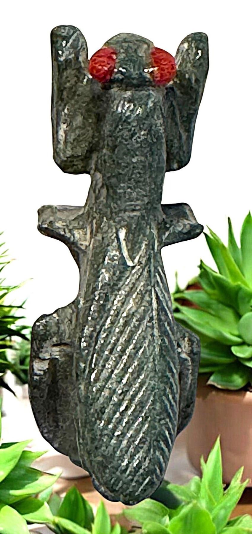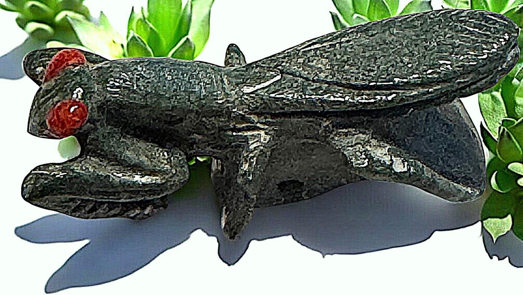 1 Large 20th century carved stone Cricket. This is quite a cool button in realistic shape with red jeweled or stone eyes. Another unusual button from the eclectic collection of Nikki Deal.