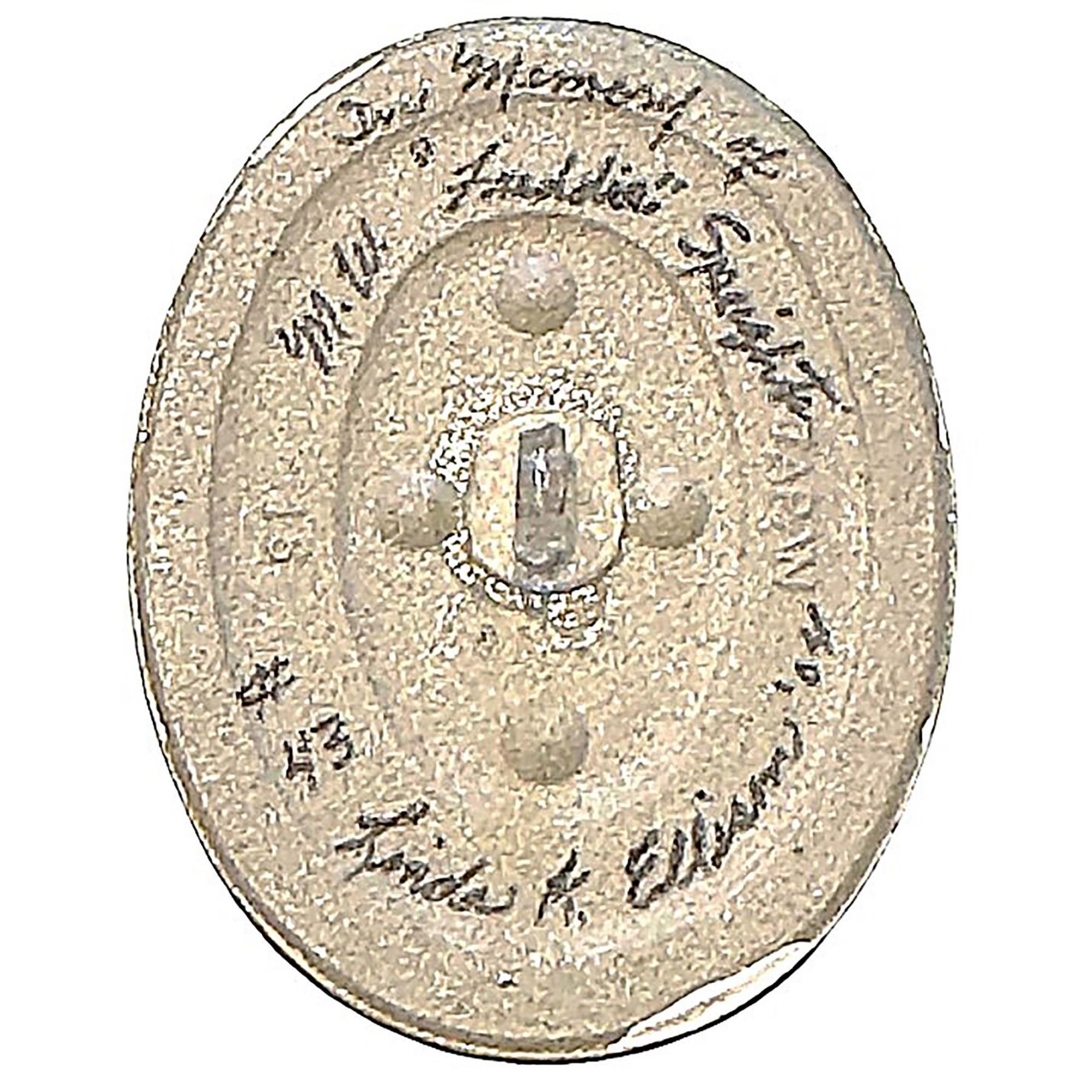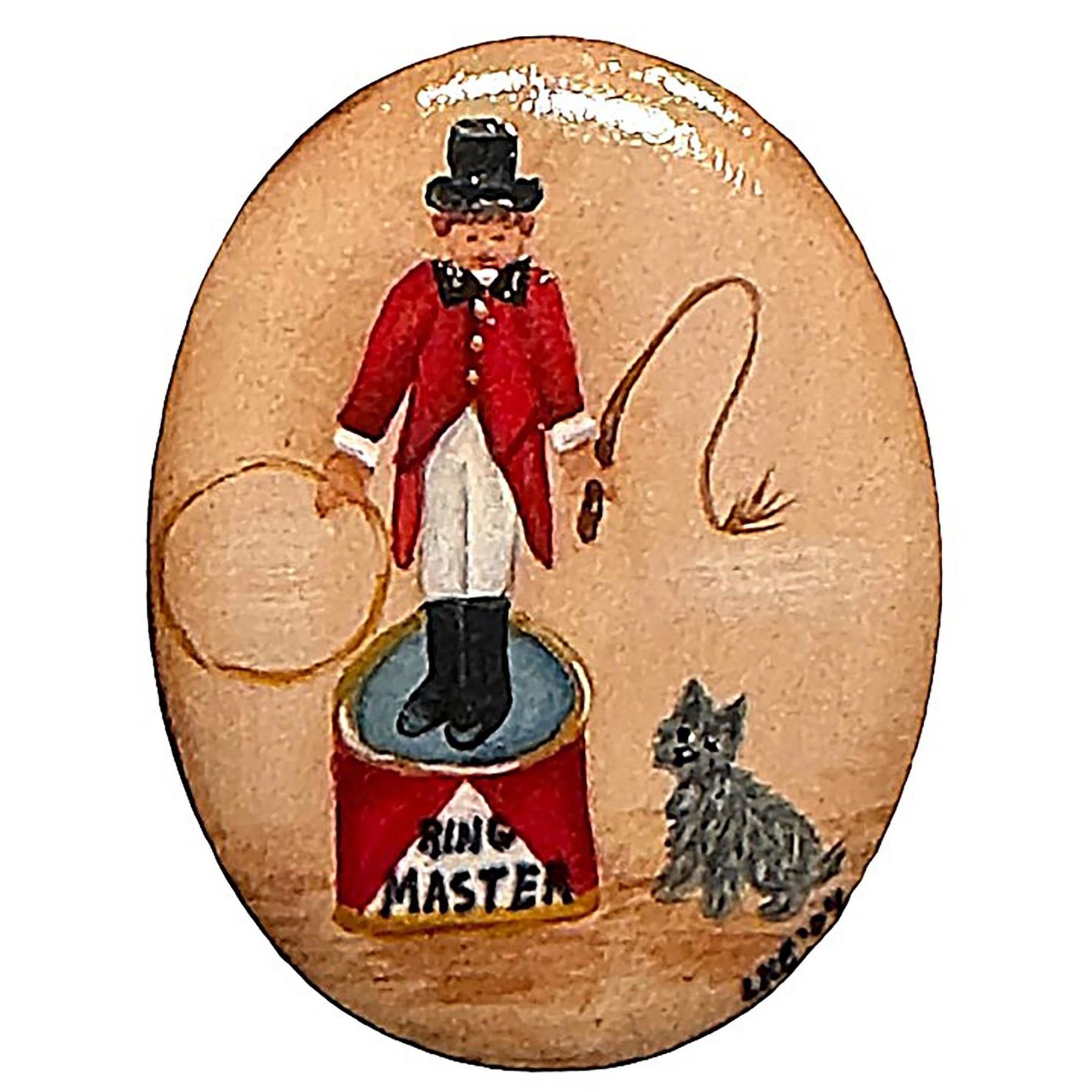 1 Large oval 21st century hand painted porcelain pictorial button. This hand painted example of a Circus tamer was designed and made by Linda Ellison was made in memory (as stated on the reverse) of the Late Freddie Speights, the NBS editor for over 20 years. Freddie was a mentor to many and his Wife Jean was a past president of NBS, Chairman of the Classification and a myriad of other jobs including NBS editor for 4 years after Freddie's passing. This oval porcelain commemorates Freddie's time as editor and is nicely executed by the artist. This is not a button that is easy to estimate as its a special one indeed.