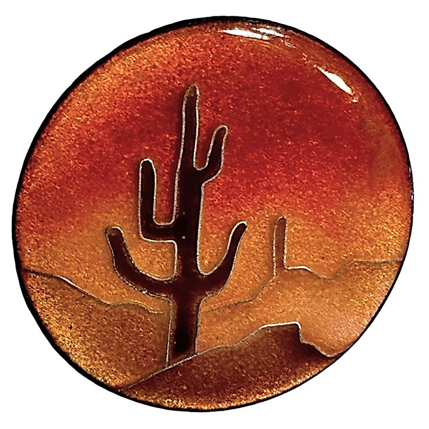 1 Large 20th century enamel button by artist Glenda Ott. As far as we know Glenda no longer makes these beautiful buttons. Glenda is from California and hand made enamel buttons for a few years and this example from the collection of the late Jean Young of California is a really nice and colorful example of her fine work. This example shows a Cactus tree scene in Cloissonne on a warm sunset hue background.