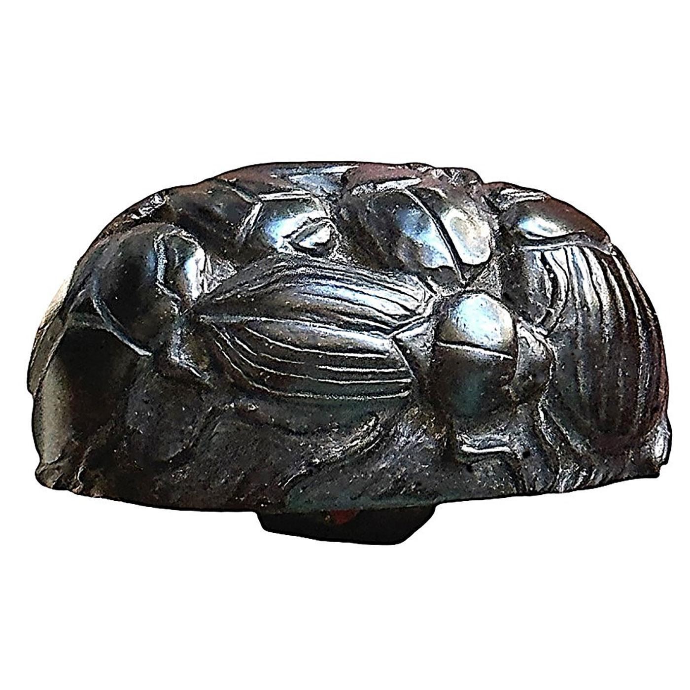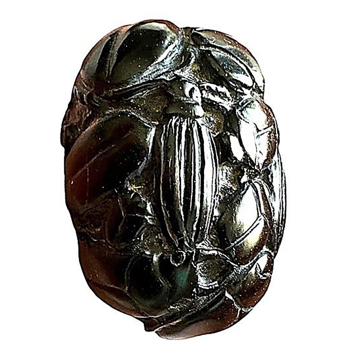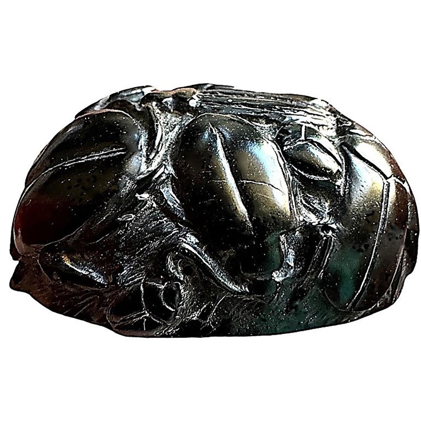 1 Large-Medium 21st century carved Beetles by Brad Elfrink. Brad is one of those extremely talented artists that is celebrated for his fine work in making studio buttons. This example from the collection of Nikki Deal, was commissioned by Nikki with Brad and is a one of a kind example. The button is carved horn we believe and is extremely detailed with Beetle bugs around the thick and horn relief oval base. A greet example of Brads work and Nikki's idea.