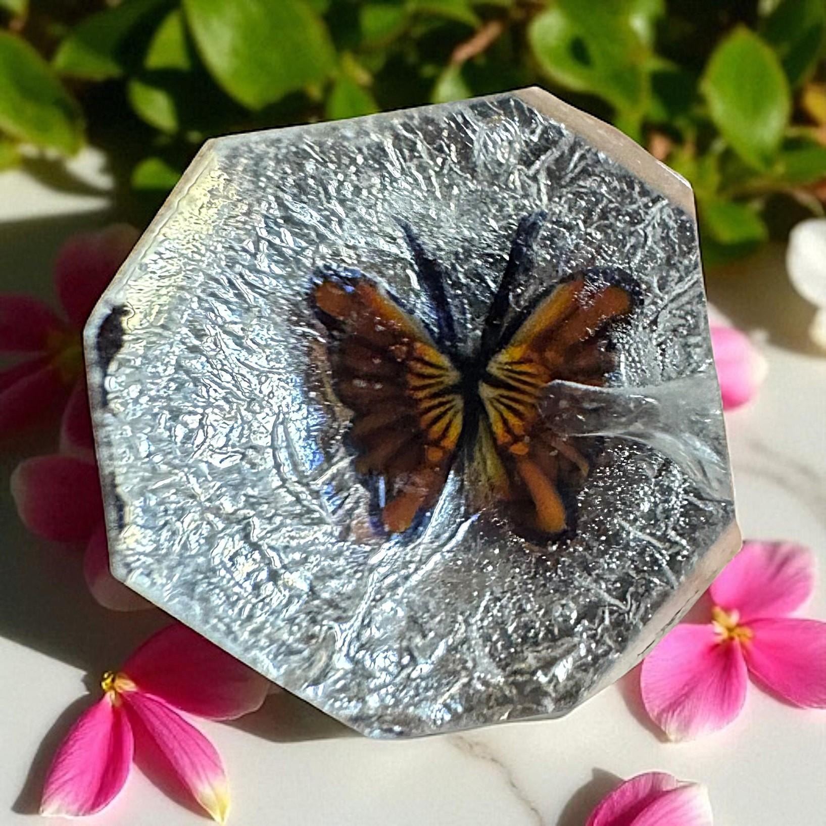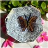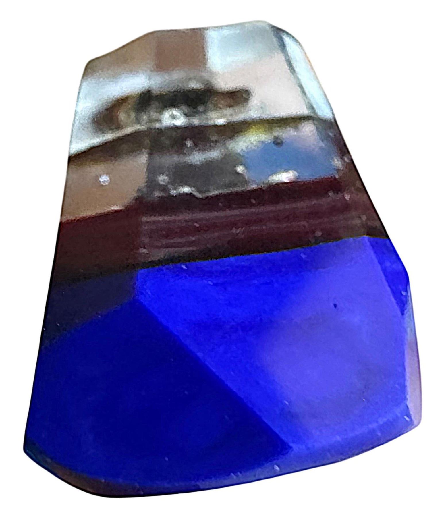 1 Small 21st century paperweight example by Greg Hanson. Greg Hanson apparently no longer makes buttons but was known for making these cubicle shaped faceted examples, unlike any other paperweight buttons we have known. In this example there are three layers of glass, the base is blue with an intermixed black & brown glass next and then a clear cap showing a beautifully detailed butterfly under it. Heavily faceted and cubist like. A loop shank into a swirlback on the blue base. A fun and great example by a more uncommon artist paperweight maker to find.