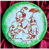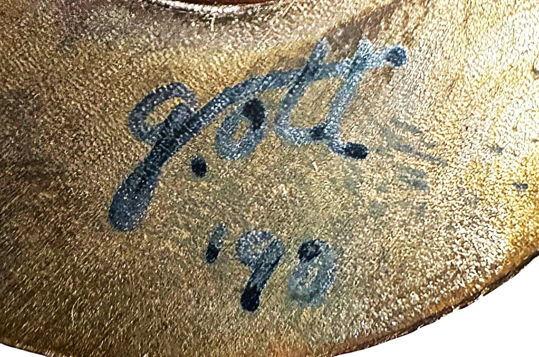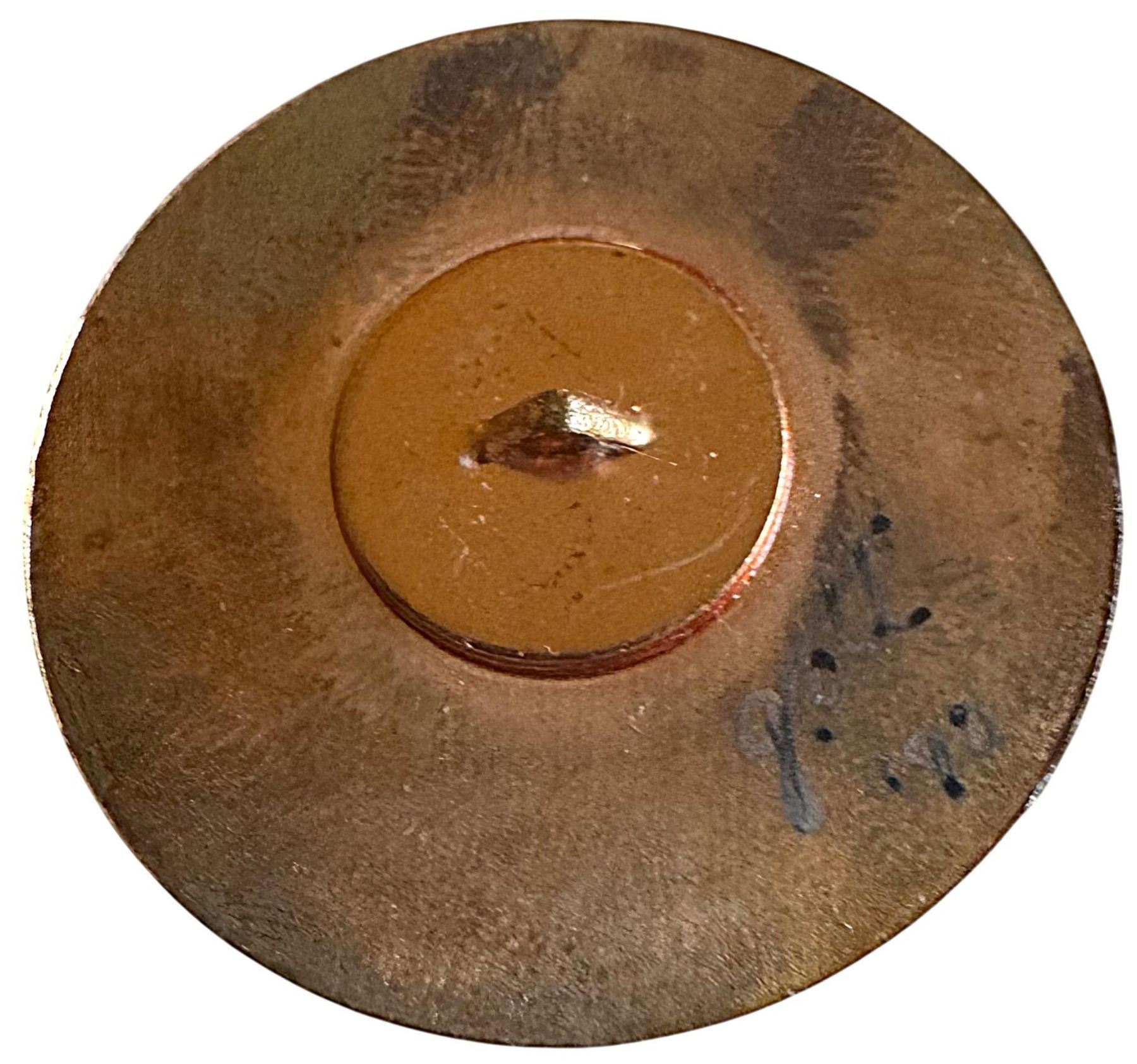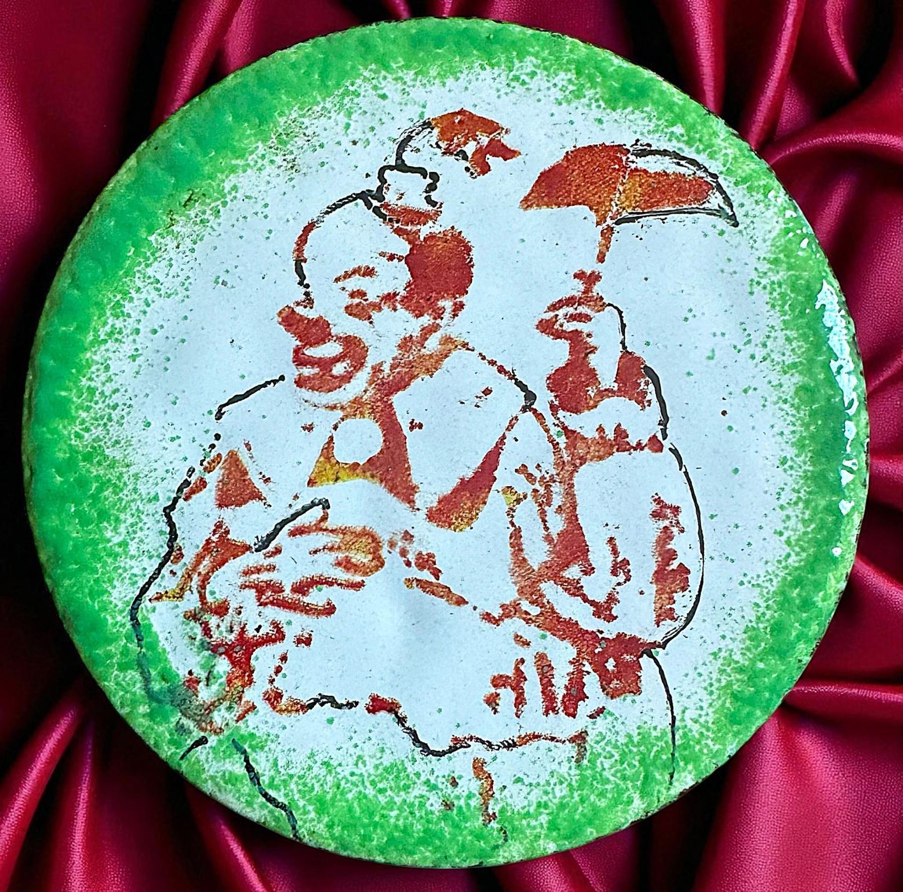 A large 20th century enamel example by Glenda Ott. Glenda was an artist from California who we believe no longer makes these fun and whimsical enamel buttons on copper. This example shows a jolly clown holding an umbrella and is in fine condition. Signed on the back.