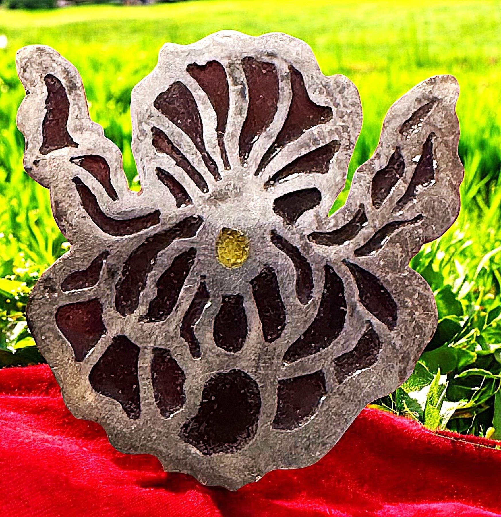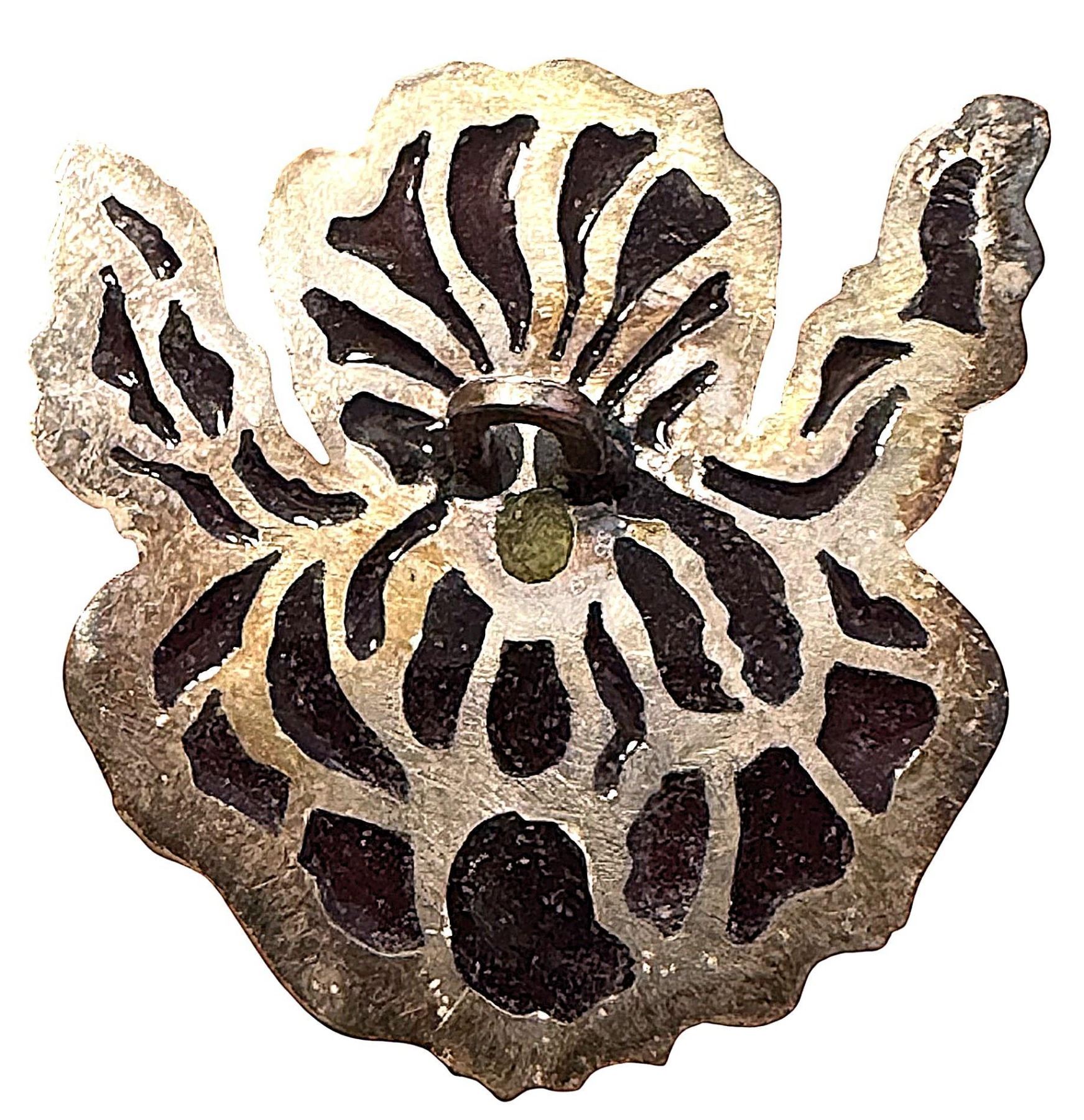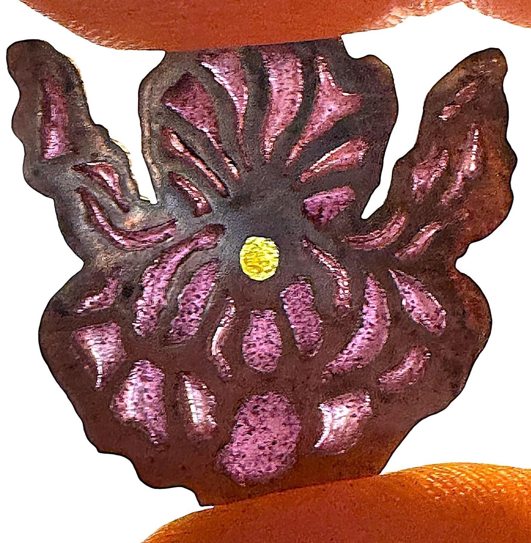 1 Large 20th century floral Plique A Jour example. This beautifully handcrafted button boasts a beautiful realistic shaped flower with striking Pink and yellow Plique a jour enamel on silver. Because of the shape the top section makes it not go through the flat measure indicating it would be a large size button.