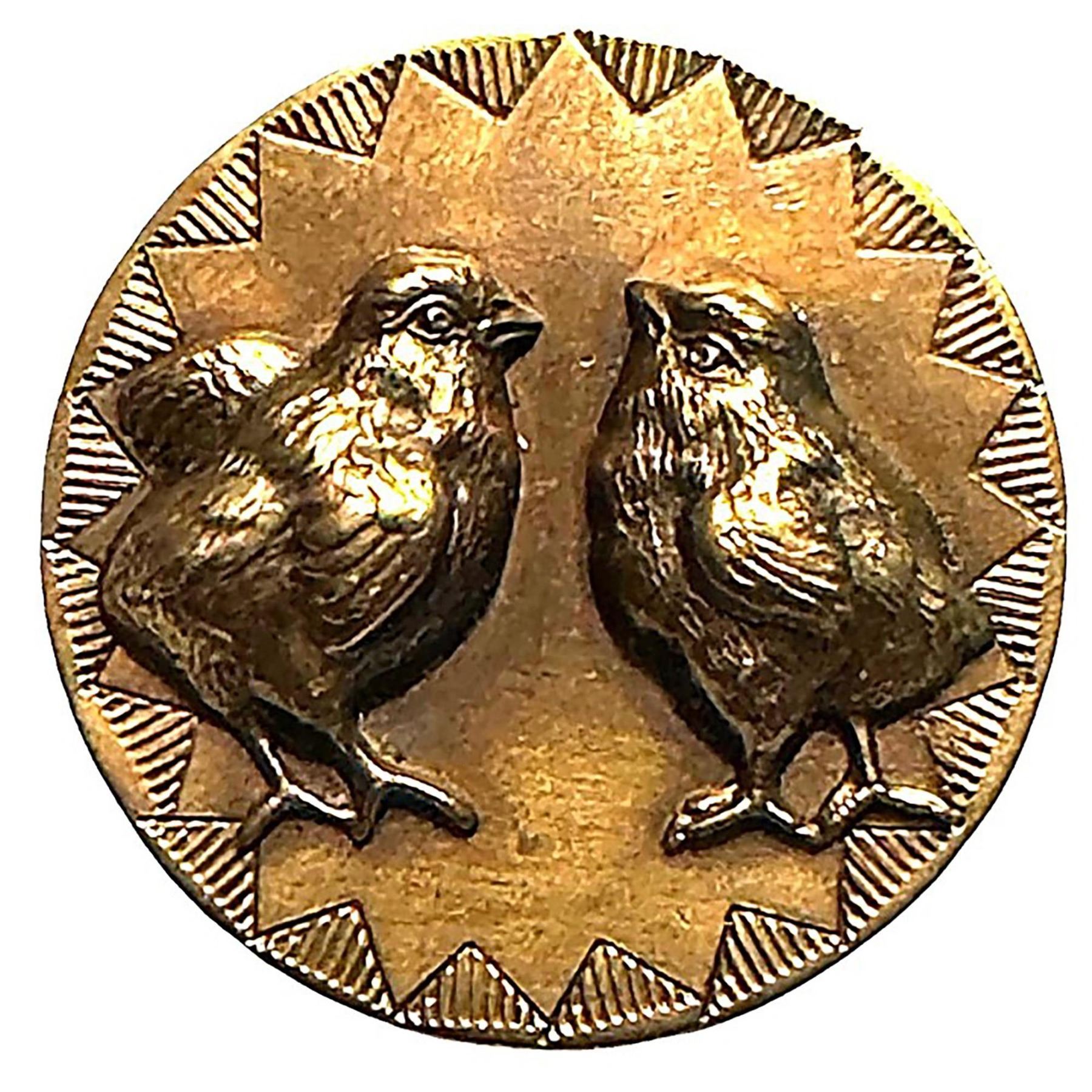 1 Large 20th C. button by the late Faith Strobel of two chicks. This nice selection came to us from a collector outside the button world along with several other lots. Faith was a talented and gifted artist who created these incredibly old looking style buttons in a variety of techniques. This example is very detailed in a 2 piece brass and is signed on the back FS. You might want to grab this up as there will no longer be any of her buttons made.?