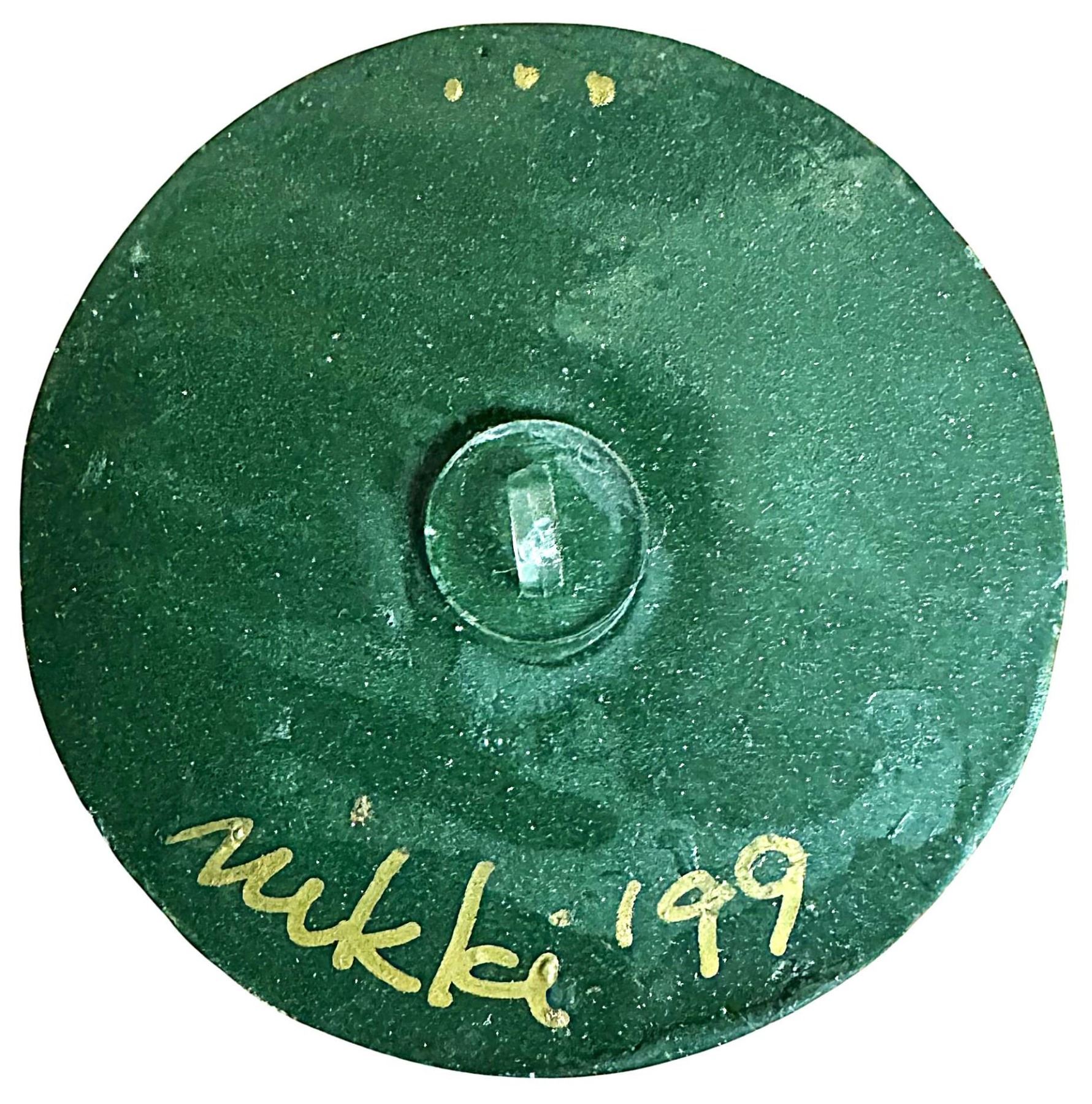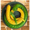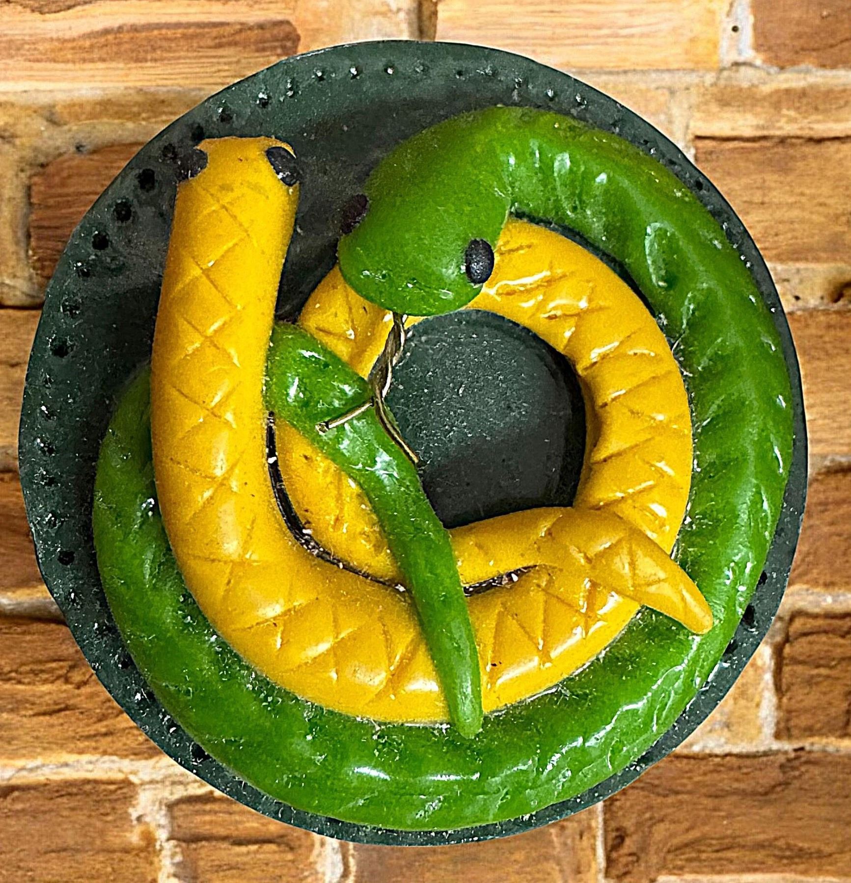 A large 20th century example by artist Nikki Deal. This is one of Nikki's prized studio example because it came from her personal collection, not one she sold. This one is made of polymer clay Nikki tells us and depicts 2 detailed coiled snakes wrapped around each other in yellow and green colors..