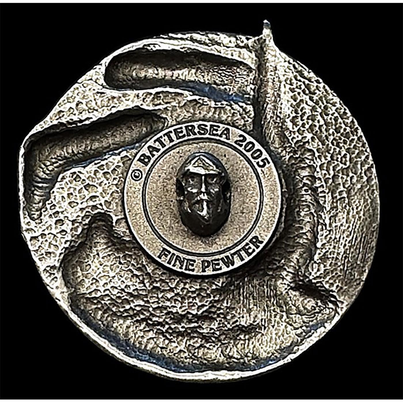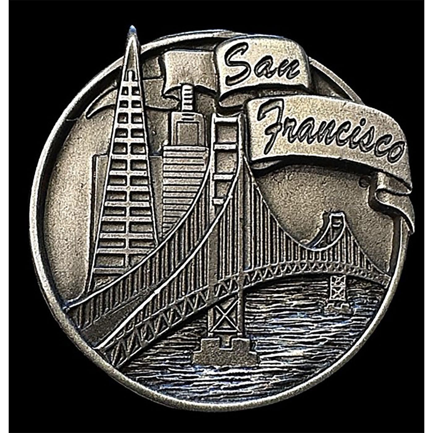1 Large 21st century Battersea Pewter button of San Francisco. Here is a wonderfully detailed depiction of famous landmarks in San Francisco California. The button with its head shank (head of Daniel Baughman, owner of Battersea) was crafted by the Battersea Pewter company in Wisconsin and dated on the reverse.