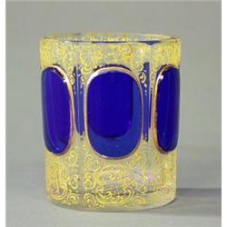 probably Böhmen, cylindrical shape with blue facets and enamel painting, height 8 cm