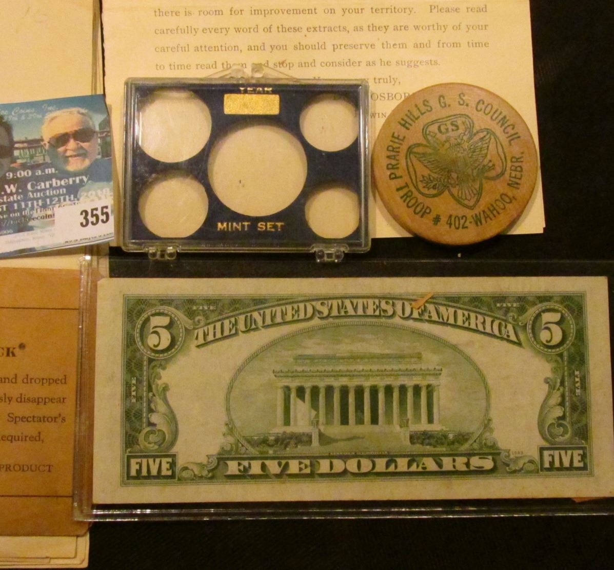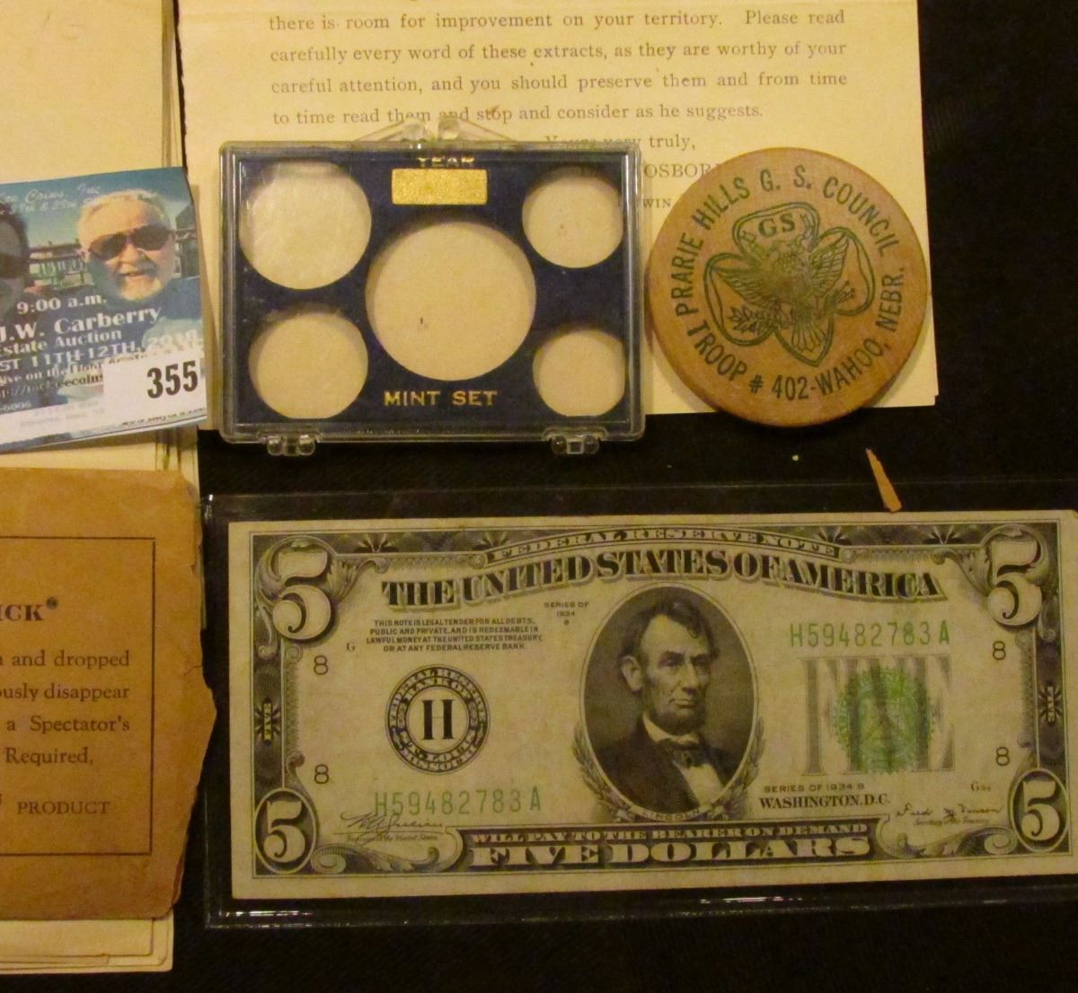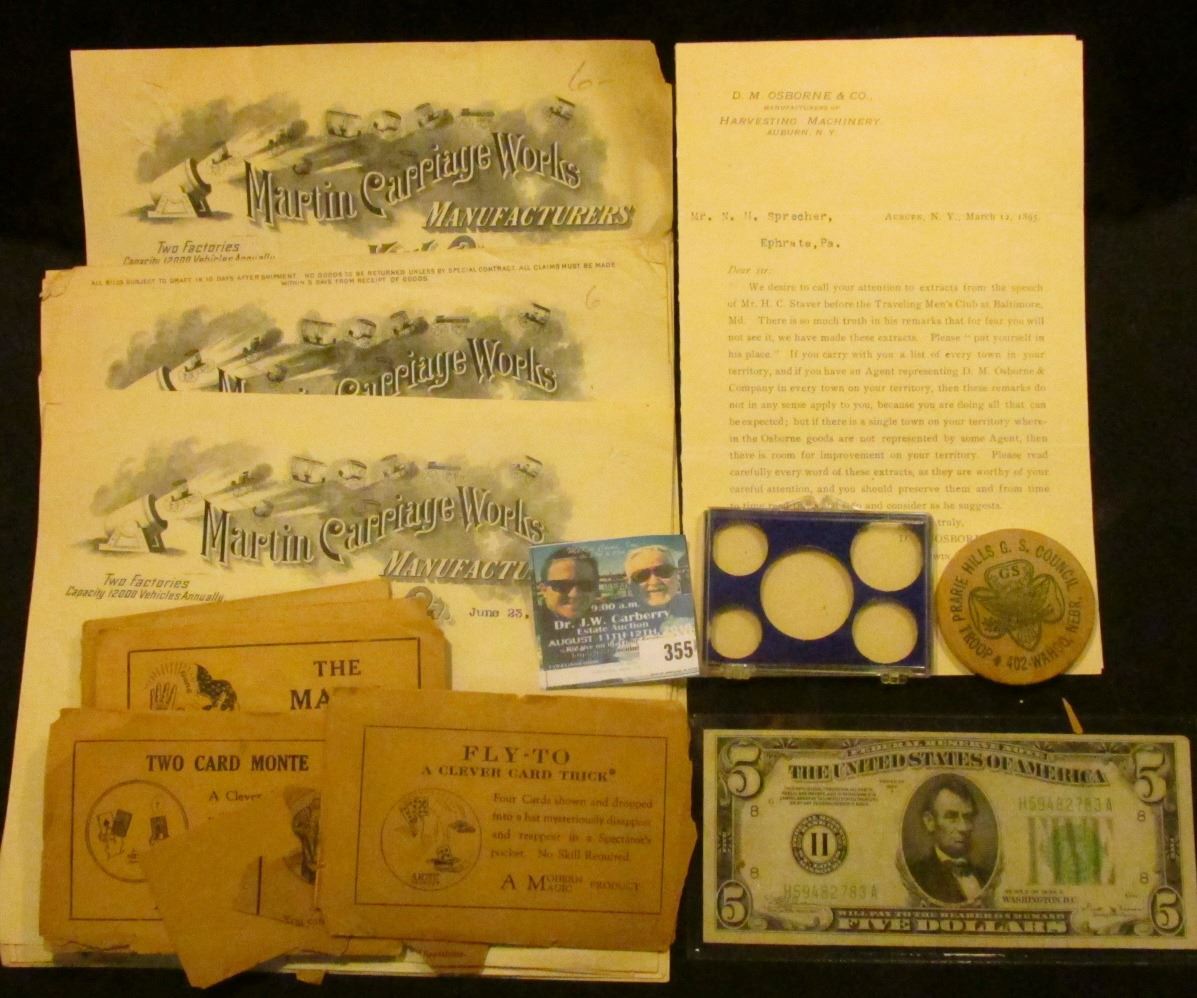 A early 1900 packet containing a magician's Card Trick; 1905 Letter on letter head "D.M. Osborne & Co. Manufacturers of Harvesting Machinery Auburn, N.Y."; used plastic Mint Set case (empty); "Prairie Hills G.S. Council Troop # 402 Wahoo, Nebraska" Wooden Souvenir Dollar; 1892 "D.M. Osborne & Co. Manufacturers of Harvesting Machinery Auburn, New York" letter on letter head; group of invoices and letter on letter heads from "Martin Carriage Works Manufacturers York, Pa." dating from 1896-1902; & Choice AU Series 1934B $5 Federal Reserve Note from St. Louis, Mo.