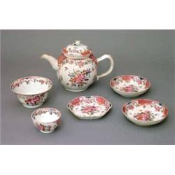 A famille rose export teapot and stand; a slop bowl; two saucers and a tea bowl....