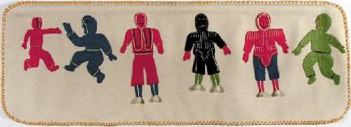 A felt, sealskin & embroidery floss wall hanging of SIX FIGURES by an unidentified Inuit artist.