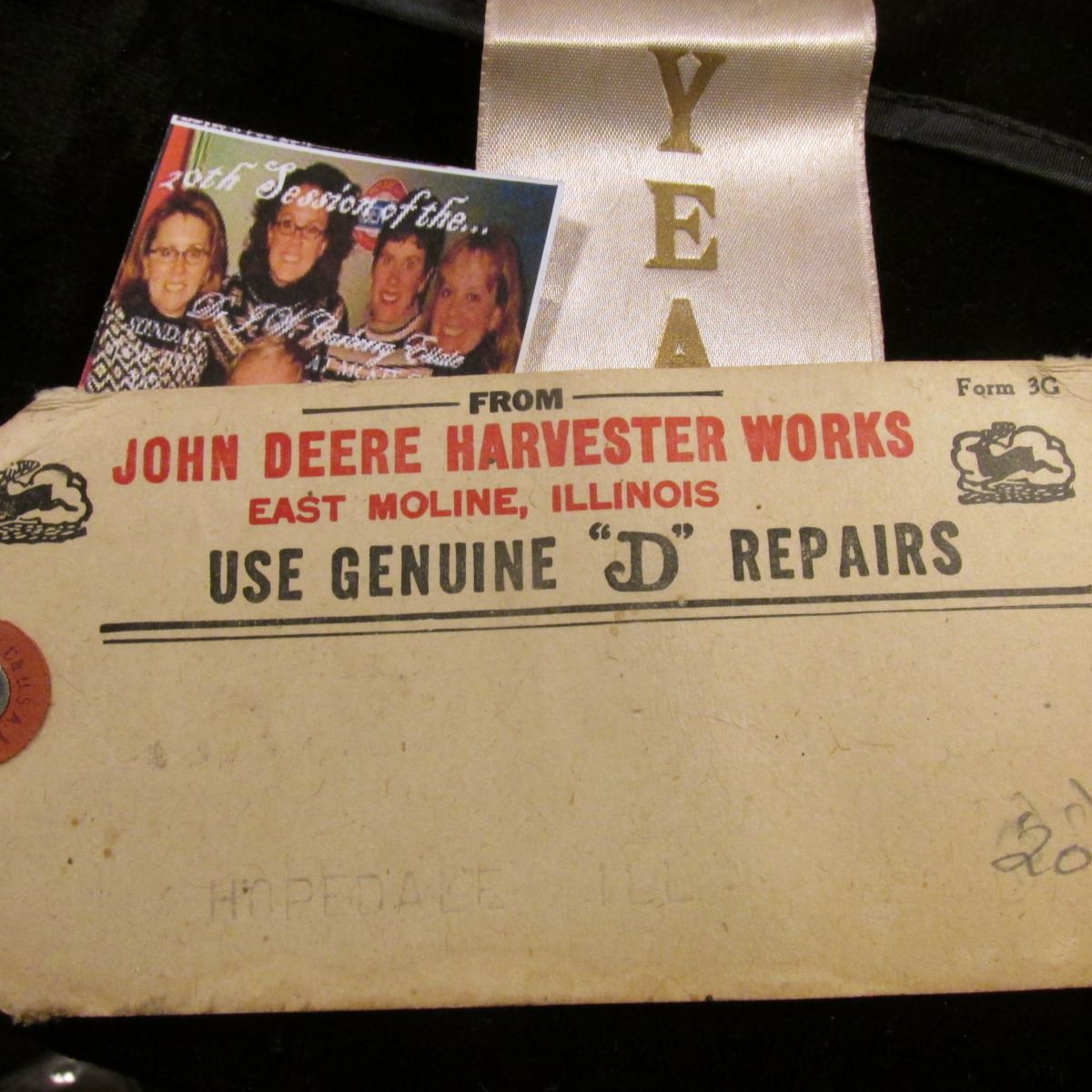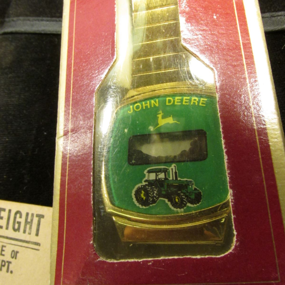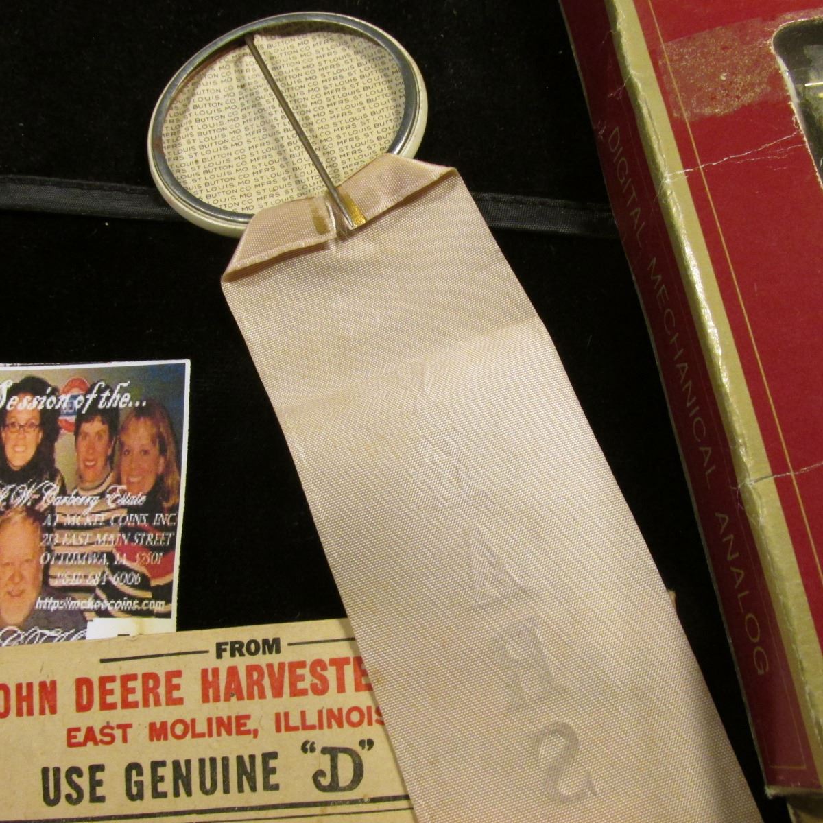 A few John Deere items: "Quality Watch" new in box, may need battery; Pin-back with ribbon "The Old Pioneers Club 18 Years"; & hang tag "Before Paying the Freight Please examine these Goods and have Damage or Shortage, if any, noted on Freight Receipt. John Deere Moline, Ill....".