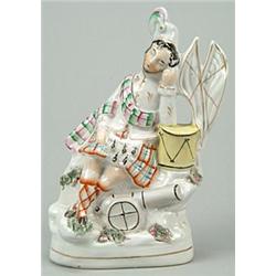 A figure of the 'Soldier's Dream', typically modelled with a Highlander asleep and leaning on a drum, partially coloured and gilt, 23cm high, circa 1854 (some areas of enamel flaking)