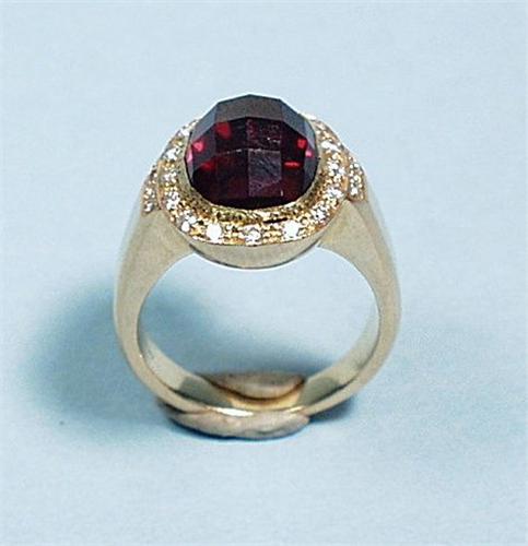 A fine 18 kt. gold ring. Set with a large central facetted garnet within a diamond set border.