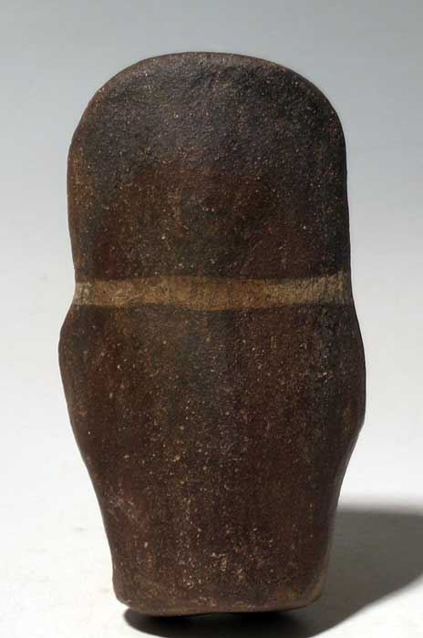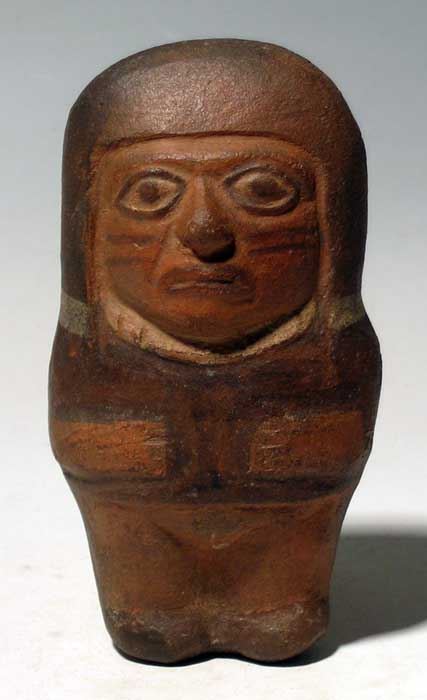 A fine Moche figure from Peru, c. AD 400 - 600, this standing female is depicted with hands held to the chest, wearing a tunic and is adorned with a segmented necklace and facial decor. H: 5 in. In excellent condition, with good mineral deposits. Ex San Marco estate.