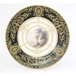A fine Royal Worcester plate, painted with a hillside view and two children by John Stinton jnr., after Corot, against primrose and deep blue borders elaborately gilded with acanthus scrolls and paterae, date code 1929, 10.5in. £300-500