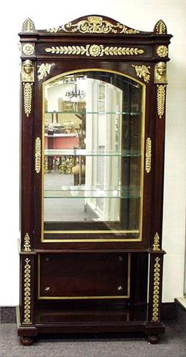 A fine antique French Empire style gilt bronze mounted mahogany vitrine. Bevelled glazed front and sides with extensive gilt bronze floral mountings. Columnar front supports mounted with female busts and feet. Interior with glass shelves and mirror inlaid backing. 33" wide, 16 1/2" deep, 73" high. 20000-25000