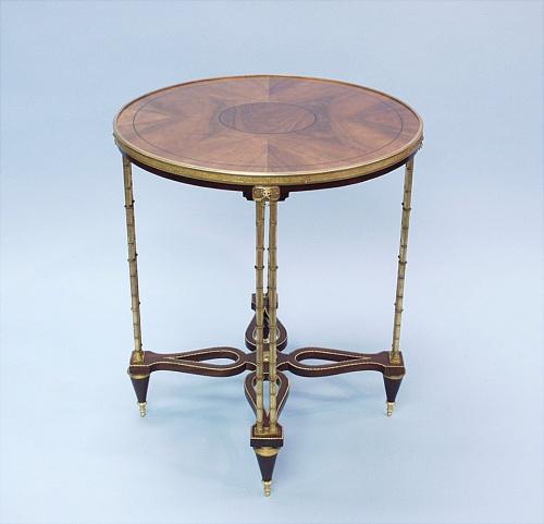 A fine antique French Empire style occasional table. The circular parquetry decorated top inlaid with ebony wood. Raised on gilt bronze stylized bamboo supports with bead mounted clover stretcher. With ringed lion's head chutes. Top 25" diameter, 29 1/2" high.