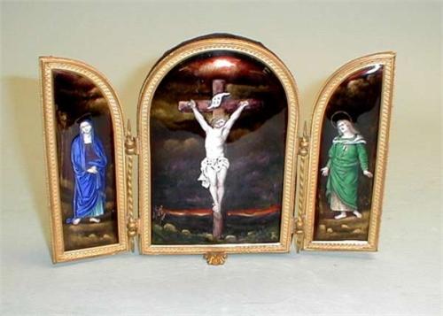 A fine antique French Limoges enamel triptych plaque. The gilt bronze framed and black velvet covered plaques handpainted and enamelled with religious figural subjects. 6" high. 3200-3500