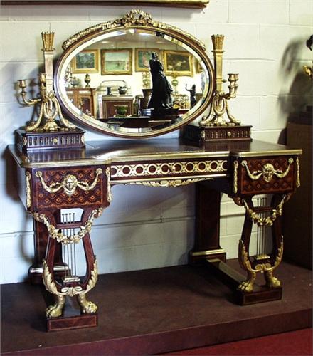 A fine antique French Louis XVI style ormolu mounted kingwood, mahogany and parquetry dressing table. The oval mirror supported on acanthus footed columns. The break front top with gilt tooled red leather surface above a central spring loaded drawer flanked on both side with deep drawers. Raised on lyre shaped front supports with various parquetry decorations and extensive ormolu floral and scroll mountings.51" long, 27 1/2" wide, 56" high. Circa 1880.
