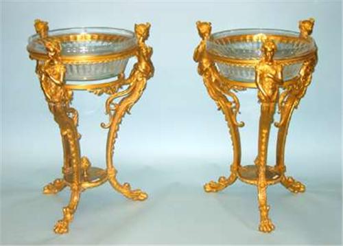 A fine pair of French Empire style crystal jardinieres on gilt bronze stands. The circular jardiniere raised on gilt bronze tripod stands cast with busts of Grecian beauties. Each 18 1/2" diameter, 34 1/2" high. 20000-25000