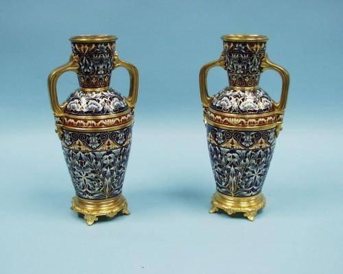 A fine pair of antique French ormolu mounted champleve decorated vases. The baluster form vases with elongated necks, raised on ormolu base and mounted with scroll form handles. Each 11 3/4" high.