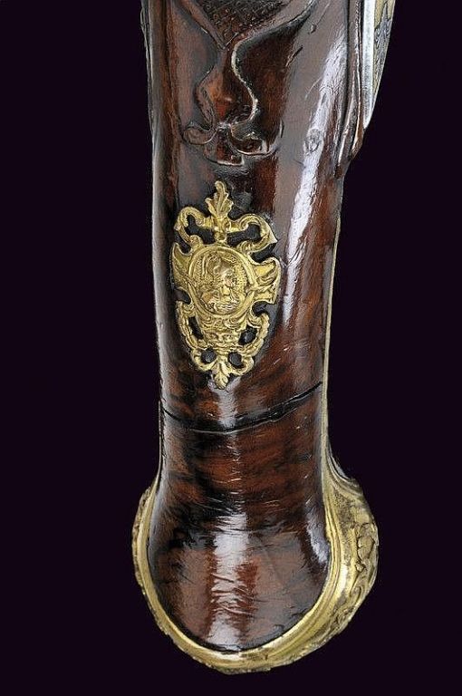 A fine pair of flintlock pistols Long, smooth, round, 16 mm cal. barrels with square base and rib, engraved and gilt with floral motifs, brass foresight; tangs and locks decorated en suite; wooden full stocks, gilt brass mounts depicting bas-relieved