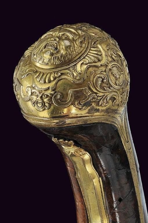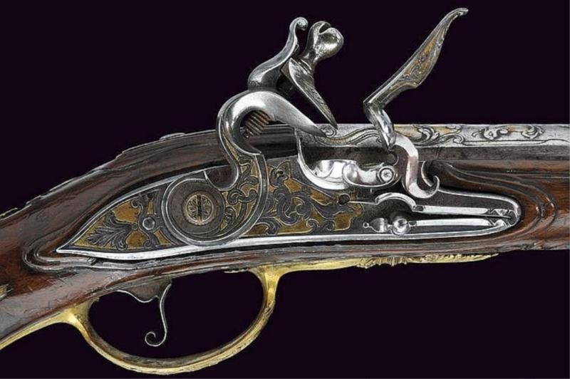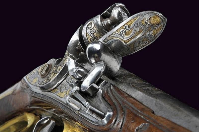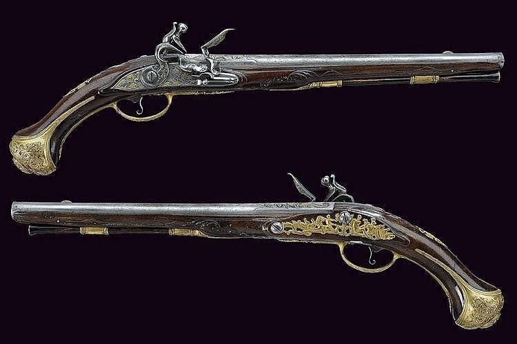 A fine pair of flintlock pistols Long, smooth, round, 16 mm cal. barrels with square base and rib, engraved and gilt with floral motifs, brass foresight; tangs and locks decorated en suite; wooden full stocks, gilt brass mounts depicting bas-relieved