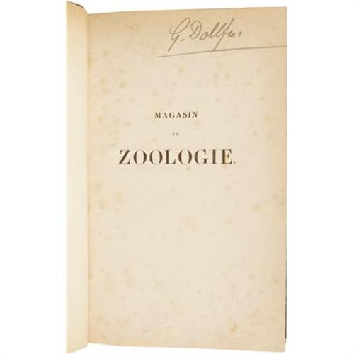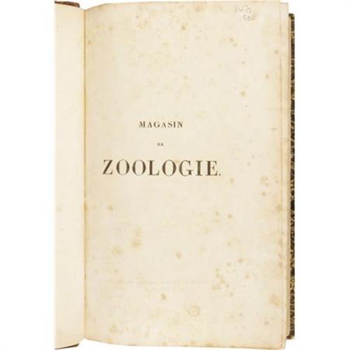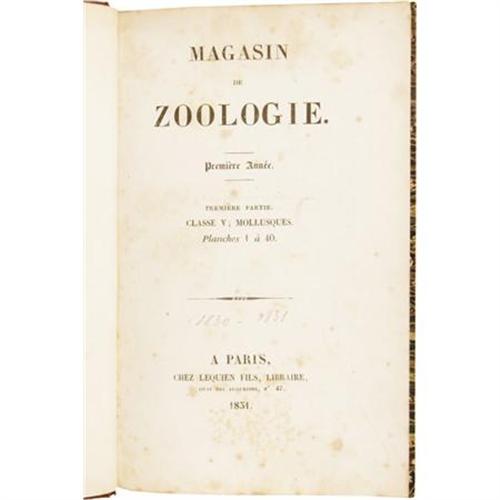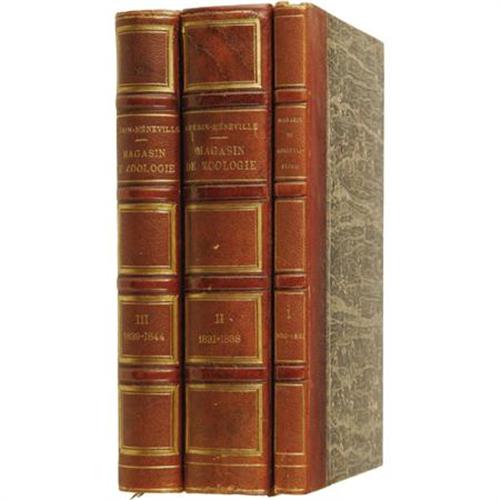 <B>Beautiful French 19th Century Three Volume Set on Mollusks With Hand Colored Illustrations</B></I>. A fine three volume set of <B><I>Magasin de Zoologie</B></I></B></I>, with issues from 1830 to 1842, edited by Father F. E. Guérin-Méneville, published in Paris by Arthus Bertrand, volume one with 40 plates, each preceded by a description in French; volume two with 100 plates preceded by a description in French; and volume three with 119 plates with descriptions in French, each uniformly bound in quarter leather bindings with marbled boards, five compartments between four raised spine bands, gilt spine titles and rules, marbled endpapers, 8vo (5.25” x 8.25”), hinges just starting, shelf wear to boards, corners worn and slightly bumped, some light foxing to contents, former owner’s bookplate on the front pastedown of each volume, else very good condition. The lowly mollusk never looked as good as in this spectacular set.<BR><BR><b>Shipping:</b> Books & Catalogs (<a target="_blank" href="http://www.heritageauctions.com/common/shipping.php">view shipping information</a>)