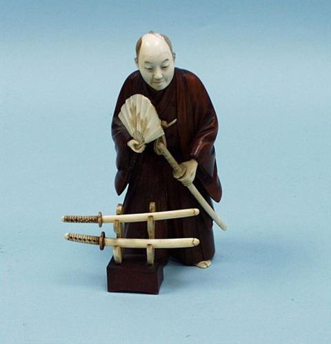 A finely carved and stained antique Japanese ivory figure of a standing samurai with a stack of swords. Signed, 6" high. Meiji period