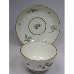 A first period Worcester tea bowl and saucer painted between gilt lines with scattered green leaves and budding rose (2) £100-150