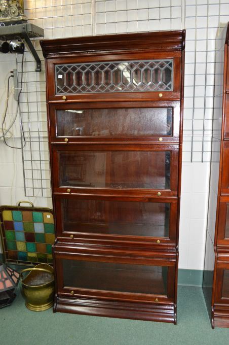 A five section mahogany stacking bookcase including one leaded panel
